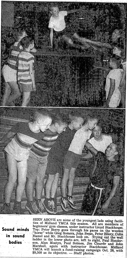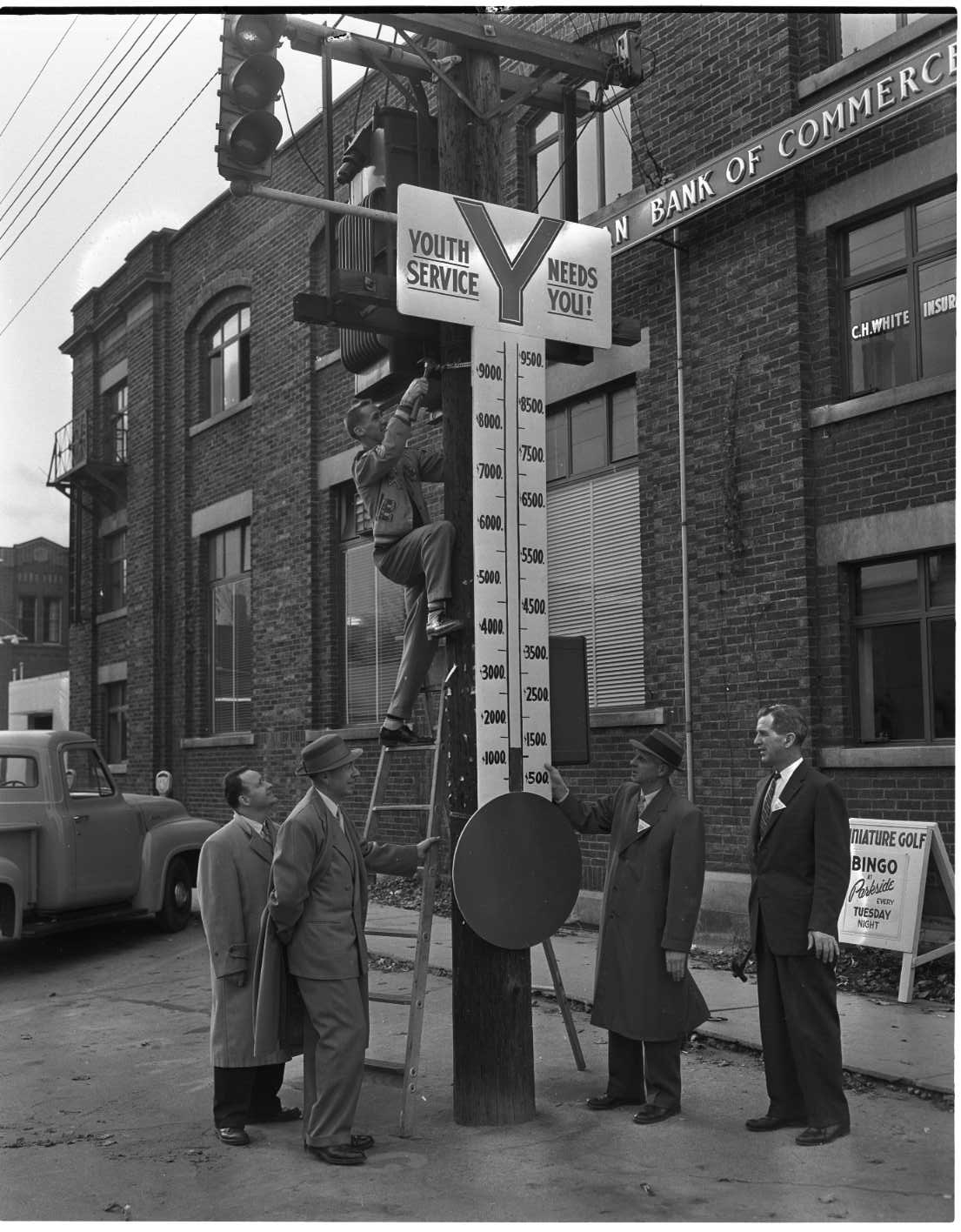 The progress of Midland YMCA fundraising drive for $9,500.00 will be recorded on the big thermometer at the corner of King and Hugel. L to R, Alex Owen, “Y” secretary, W. H. Mutch, Jack Doughty campaign chairman and J. W. Smith, executive secretary. Up the ladder is Lloyd Stackhouse, the physical instructor at the “Y”.