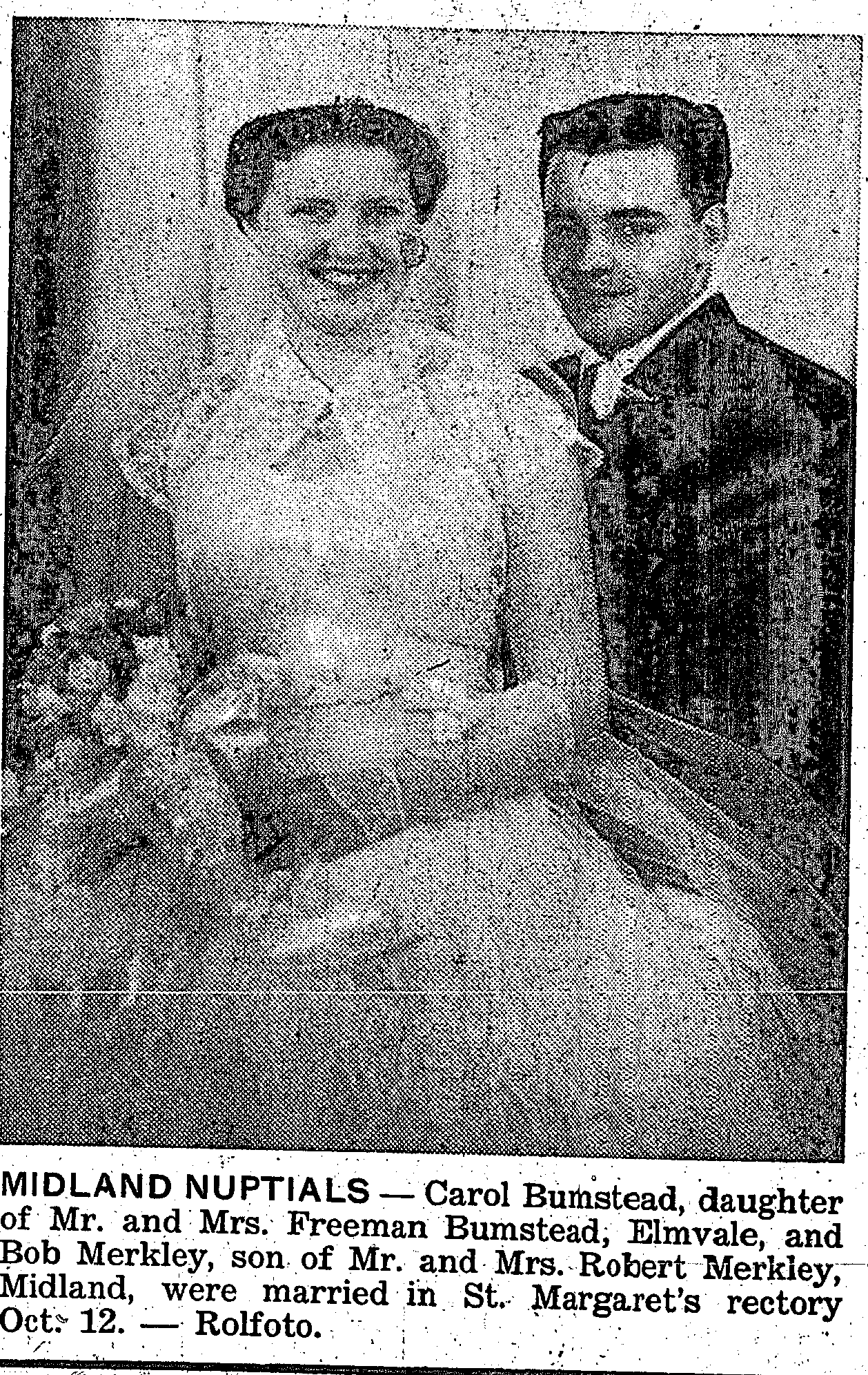 - Grandson of the late Jabez Dobson, one of Midland’s first settlers, Wesley William Richardson died Oct. 23 at Midland in his 71st year. Funeral service was held Oct 25 at A. Barrie and Sons funeral home with Rev. J. L. Self officiating. Interment was in Wyevale cemetery. Mr. Richardson was born August 18, 1887, in Flos Township. He was educated in Midland and in 1916 he married Mabel Miller at Wyevale. Wesley Richardson had lived in this community most of his life spending 30 years in Port McNicoll as caretaker of the school and the last three years in Midland owing to ill health.