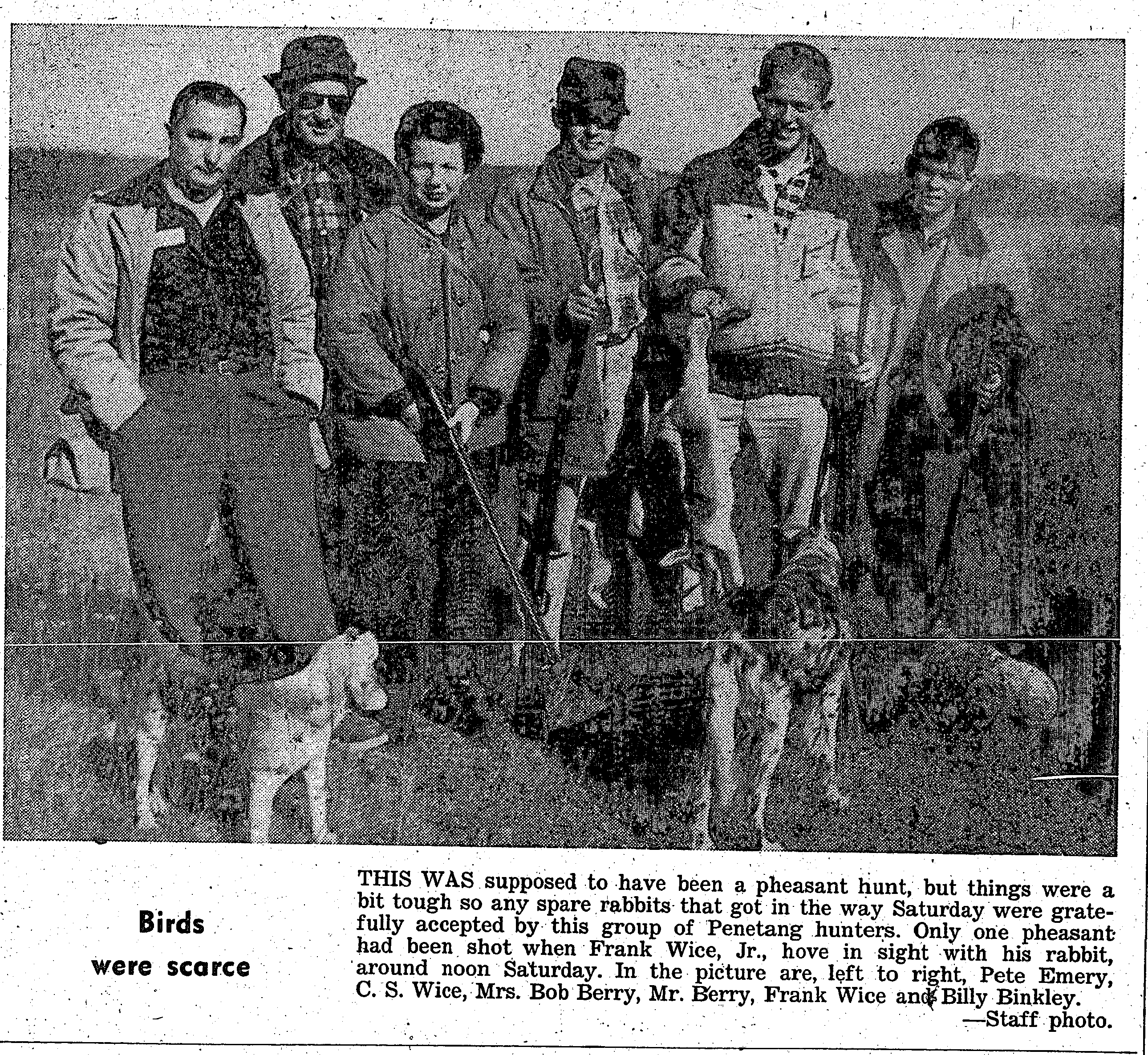 Saturday’s pheasant hunt sponsored by the Penetang Chamber of Commerce who released 70 birds last Wednesday at two farms northwest of Penetang, provided a lot of hunting but not too much shooting for the large group of hunters who turned out. John Powers got the first of less than six birds shot.