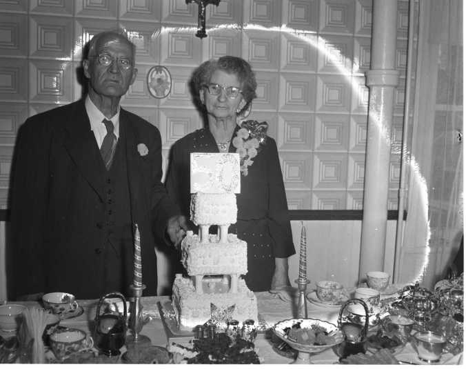 Mr. & Mrs. Henry Gamelin of Victoria Harbour are shown as they cut the cake at their golden wedding anniversary celebration in their home Saturday. Starting as a trimmer at ten years of age, Henry worked for Waldie Lumber Company for 45 years and when it closed he worked for McGibbon’s in Penetang for 13 years.