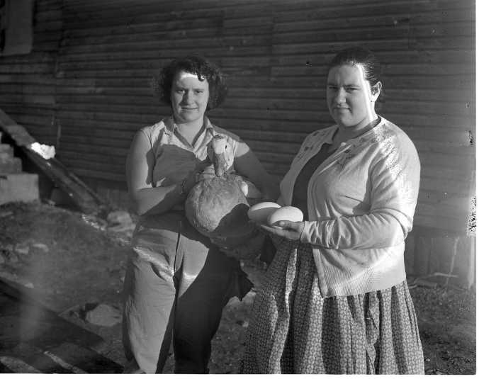 Not the goose that laid the golden egg but she does lay double yoked eggs. Edna Marchant holds the goose that laid the eggs held by her sister Mary. The girls and the goose live a farm on Concession 3 Tay, near the Old Fort school.