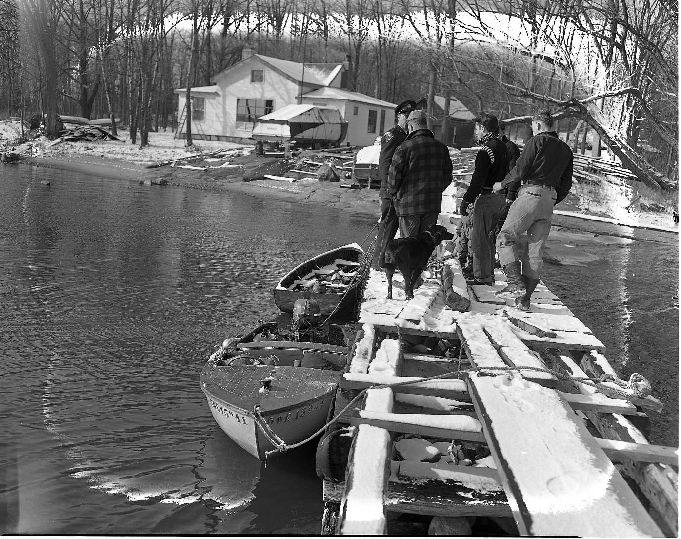 Provincial constable Bill Mohan, who is investigating the tragedy that took the lives of four Toronto hunters Saturday, is talking to some of the men who assisted with the search. Boat in which the four men were riding is tied to the dock at lower left. [The group had stayed the night at a friends cottage at Robin’s Point and headed out early on Saturday morning for the marshes around Green Island between Waubaushene and Honey Harbour. The weather was very stormy and it is assumed that the boat capsized.]