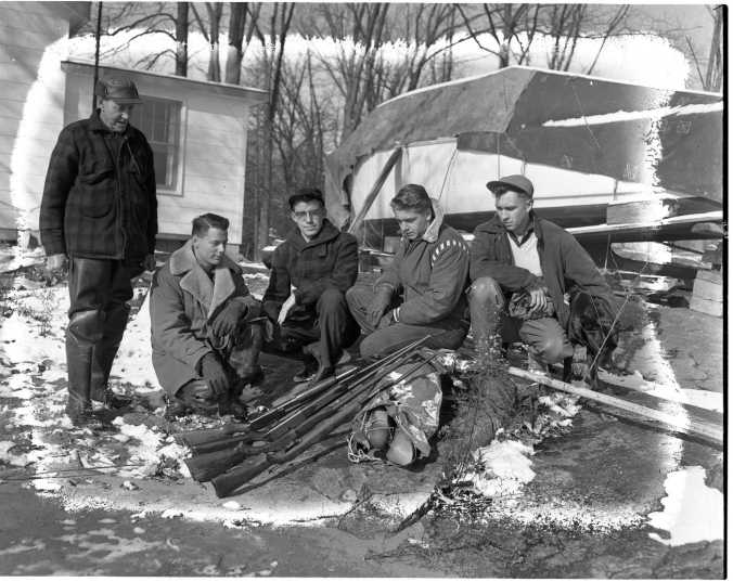 These men saw the partially submerged boat of the four deceased Toronto duck hunters floating by this cottage owned by W. E. Russell, on the left. They all assisted in the search. Donald Curl, Ian Miller and Ken Thistle all of Toronto and Barry Petman, of MacDiarmid, Ont.