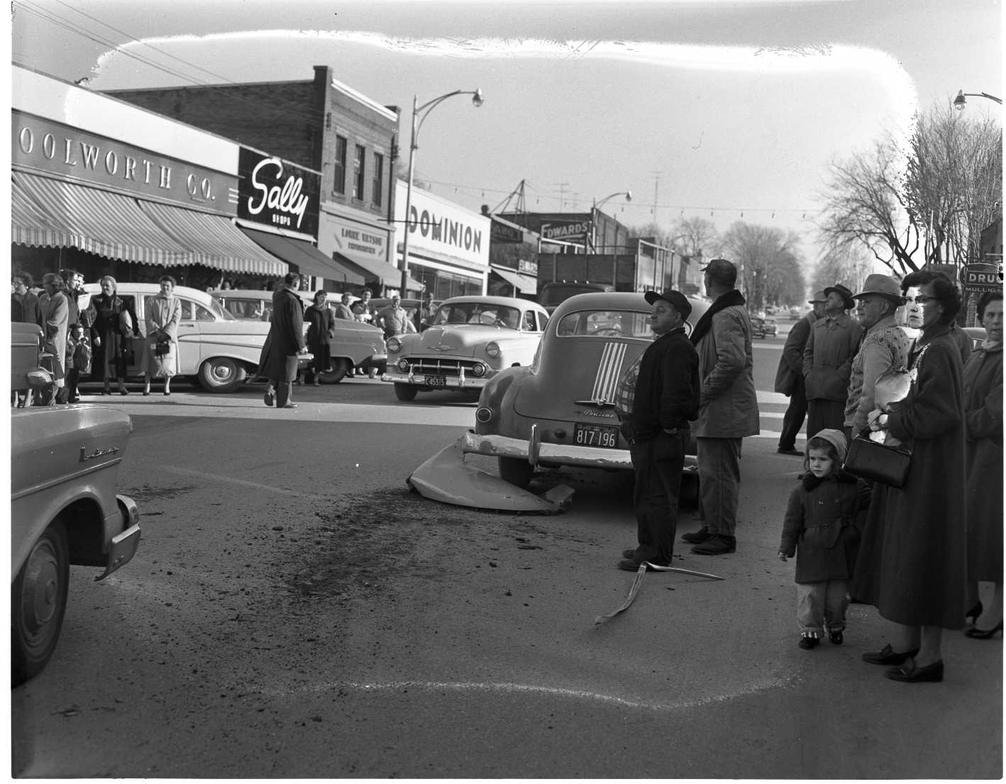 Brake failure on a car driven by Mrs. Peter Maxwell, RR #1 Midland, was given as the cause of this accident on King Street Thursday afternoon which involved four cars but no injuries. [The runaway started at 259 King which would be up near the Odeon Theatre and ended in the CPR express lot at Bay and King.]