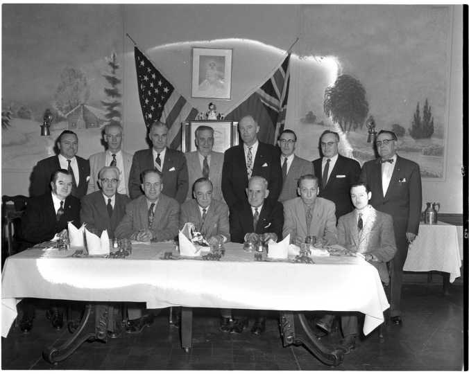 Gathered together in the Georgian Hotel Tuesday night were fifteen men who had served as presidents of the Midland Lions Club since its inception 20 years ago this month. Front row, W. A. McArthur, Don Swinson, Edwin Walker, Dr. Art H. Pinchin, Gilmour Nesbitt, John Hodges, W. S. Struthers; back row, Bill Jeffery, Gordon Boyd, Jack Doughty, Alex MacIntosh, Hugh Blair, Lorne Watson, Bill Orr and Walter Woods.