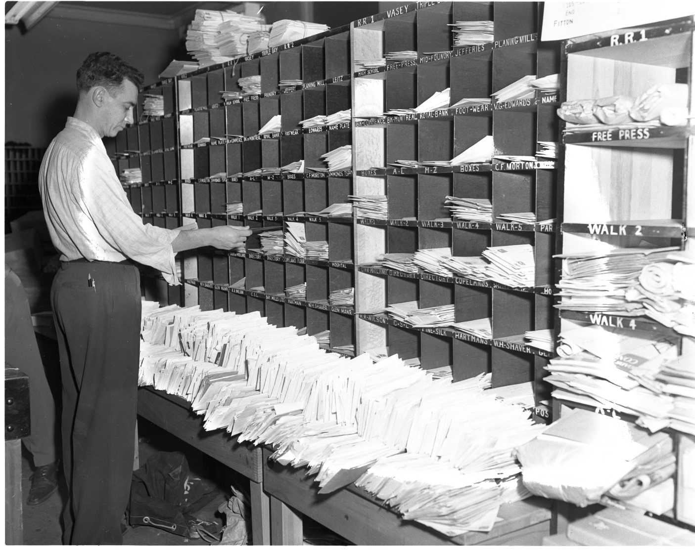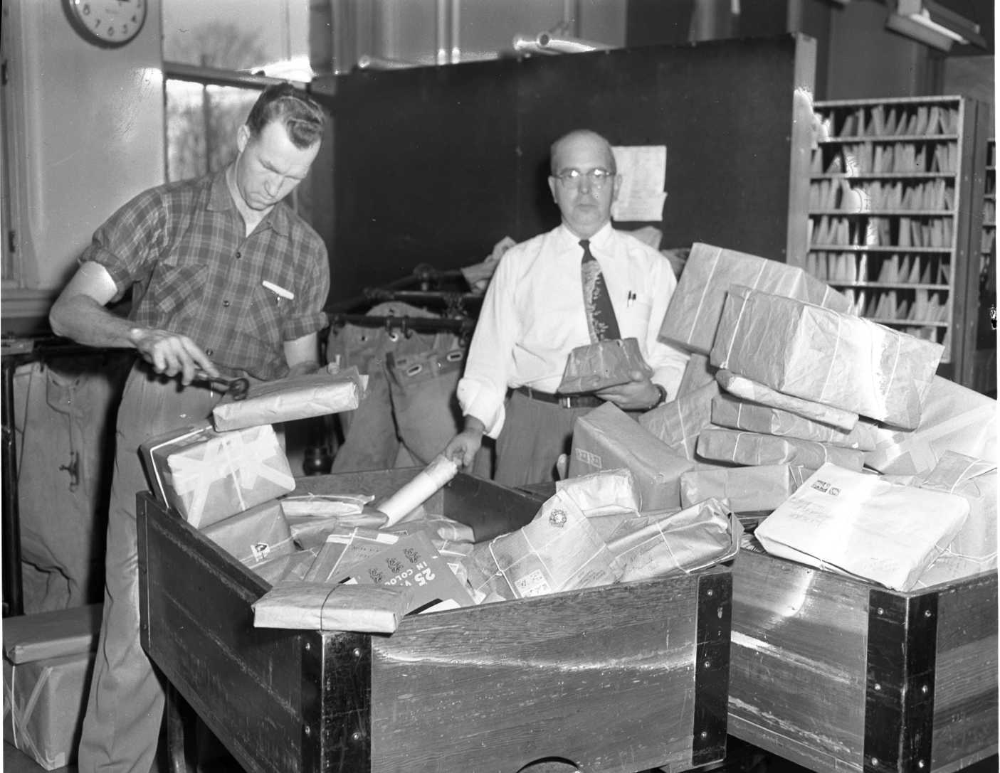 This is the biggest week of the year for both the regular and extra staff at Midland’s post office. Post-Master W. F. Bourrie, right, and Jim Wallace get parcels ready for distribution by mail carriers to hundreds of Midland homes.