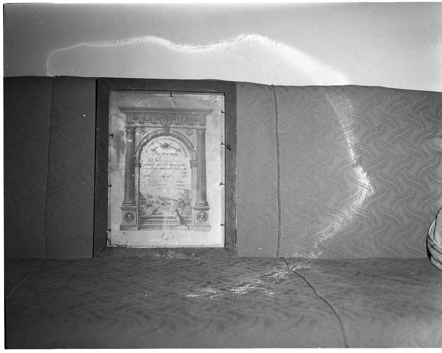 Mrs. John Maxwell and her mother in law Mrs. M. Maxwell discovered this old lodge certificate while cleaning out the attic of the home they had sold on First Ave. Port McNicoll. The certificate had been used for backing in a picture and was dated 1808. The ladies presumed it had been brought from England as the lodge was the “Grand Surrey Lodge, Mother Lodge of the World”. The organization was the Royal Antediluvian Buffaloes. [A later edition of the paper stated that theatre manager Al Perkins had been a member at one time and that a chapter still existed in Niagara Falls.]