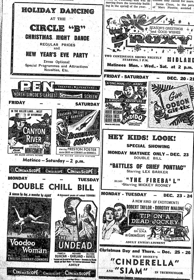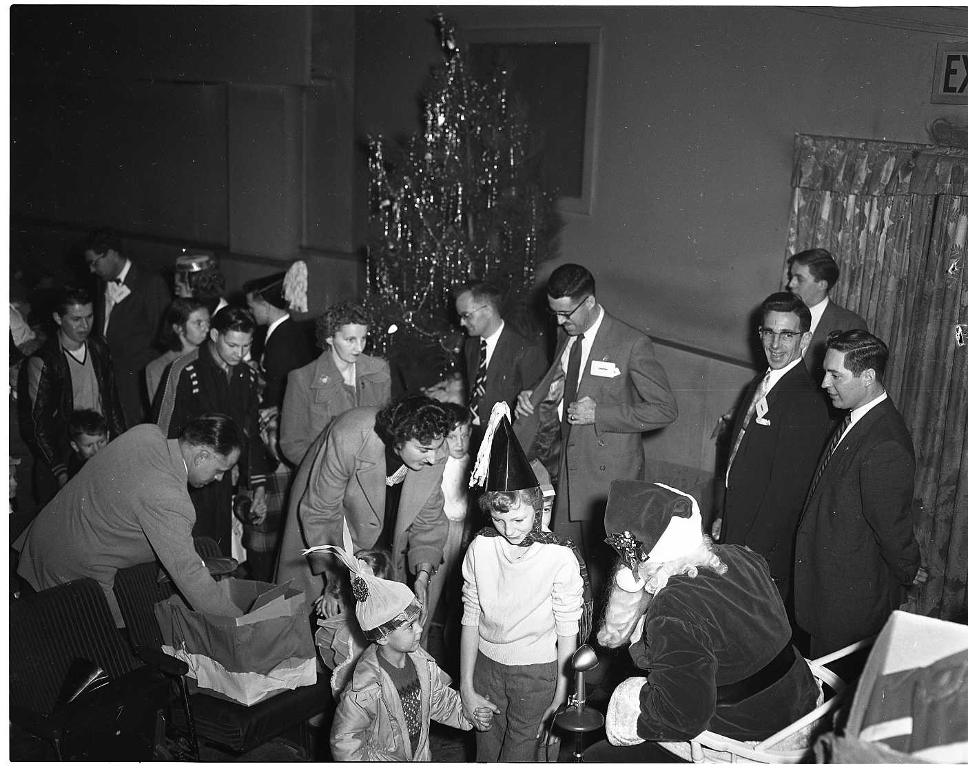 Santa had some dandy gifts for the huge “family” of the Shoe Corporation of Canada at Midland’s Roxy Theatre Saturday morning. Employees and their families from Midland Footwear, Midland Industries Ltd. and Fern Shoes, Penetang, completely filled the theatre for the event. Officials of the firm are seen in the background directing traffic for Santa.