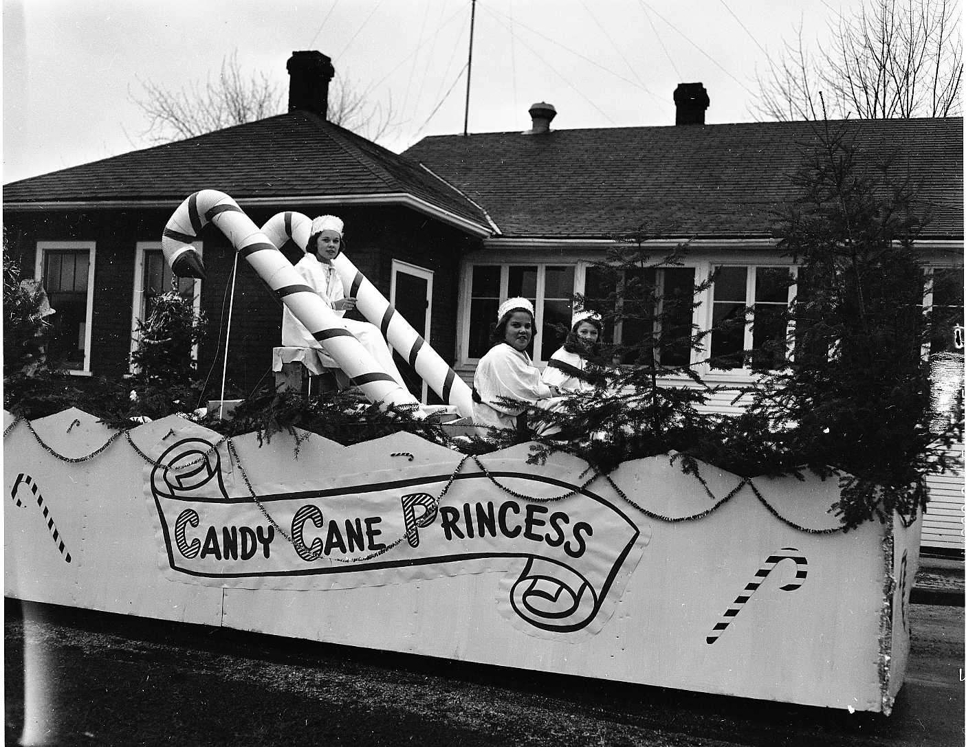 Coldwater Santa Claus Parade, the Candy Cane Princess is Sally Galbraith, her court is Sandy Galbraith and Beverly Langman.