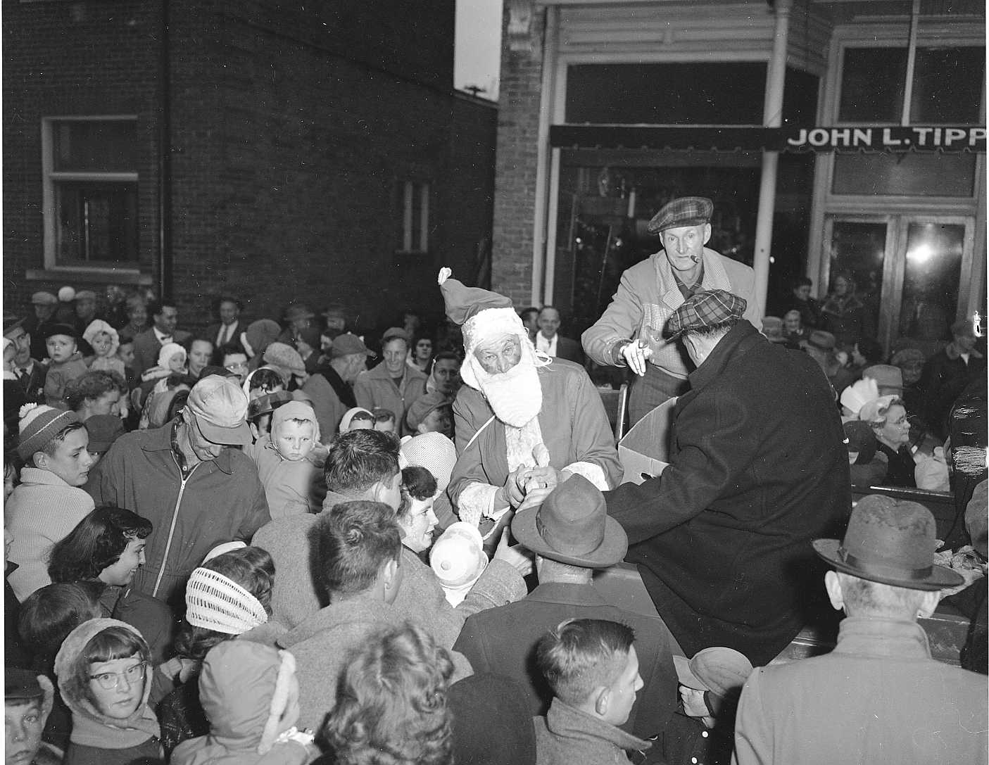 Despite the gloomy weather the Santa Claus parade staged by the Lions Club and merchants in Coldwater Saturday afternoon drew the usual large crowds. Santa is seen distributing candy to the children.