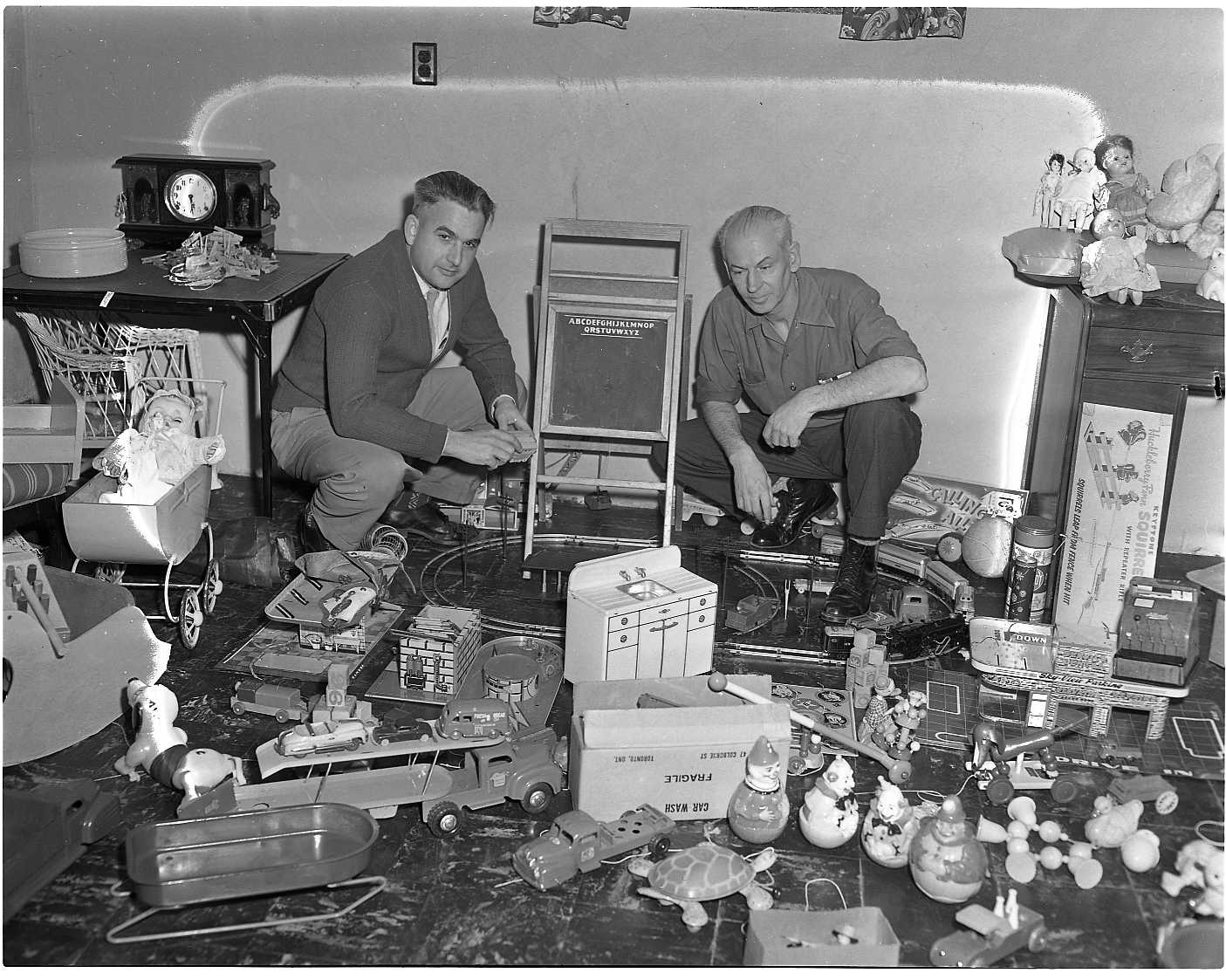 Hundreds of toys are made shiny and new again in Lions Club member Gordon Boyd’s basement workshop. Mr. Boyd has been doing this in his basement for five years with the help of other club members. Cecil Launder, left, is chairman of the Lion’s Health and Welfare Committee which is in charge of this project.