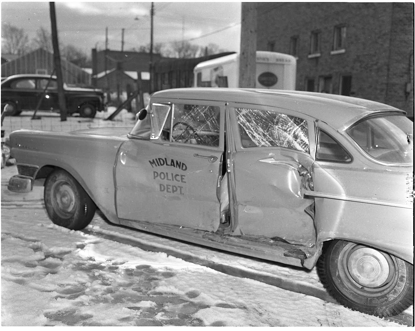 The result of a collision at the corner of Dominion Ave. and Queen Street Monday morning. Sgt. George Wainman who was driving the police cruiser escaped injury, the other vehicle was a local taxi. [I believe this is the lane behind Mr. Grocer looking south, the large building on the right is the Georgian Hotel and the glass house in the upper left is Mac Perrin’s greenhouse?]