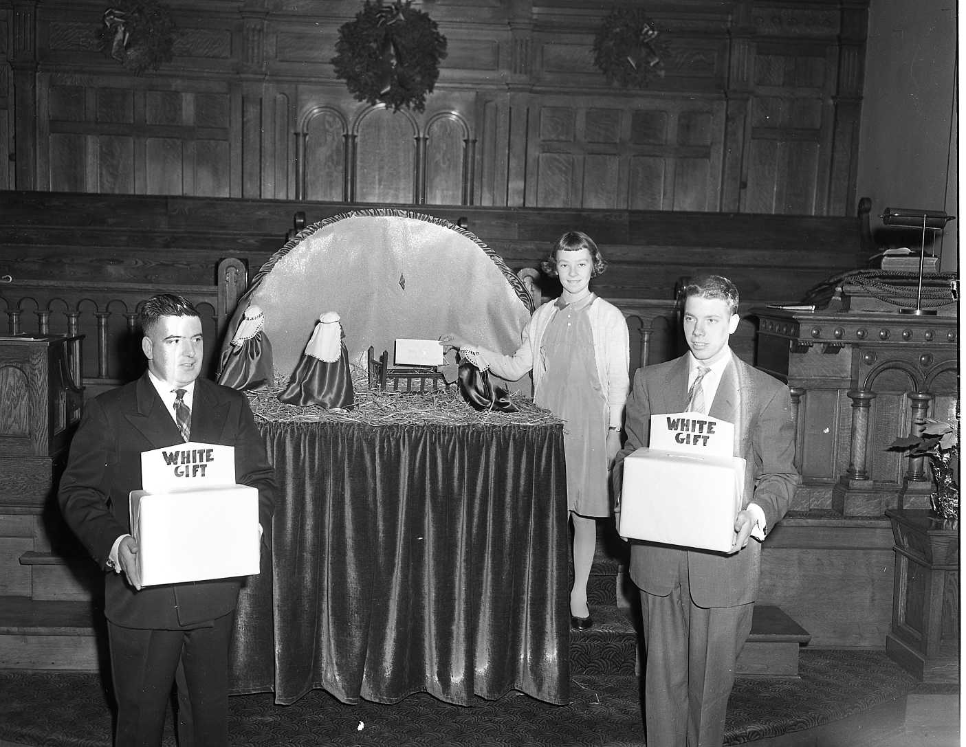 White gift Sunday has been an annual event for more than a decade at St. Paul’s United Church, Midland. Money received is to help young students from the church prepare for ministry. Holding the boxes are Bruce Gazely and Kenneth Walker. Placing a gift envelope on the crib is Sonja Beatty.