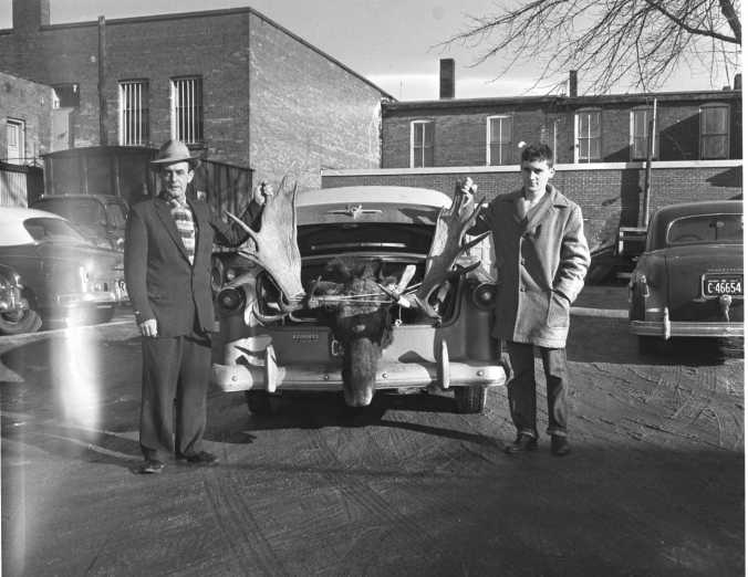 This monster moose was shot by C. F. Townes of Wyebridge who works as an electrician at a mine at Spanish Ont. The animal had a 57-inch antler spread and weighed about 1,600 pounds. Mr. Townes son Jim is at the right.