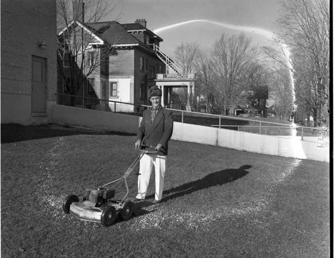 St. Andrew’s Hospital caretaker Oscar Jean…(paper ripped, the last name missing) can be seen with the lawnmower out Friday morning on the hospital lawn. (Just before Christmas)