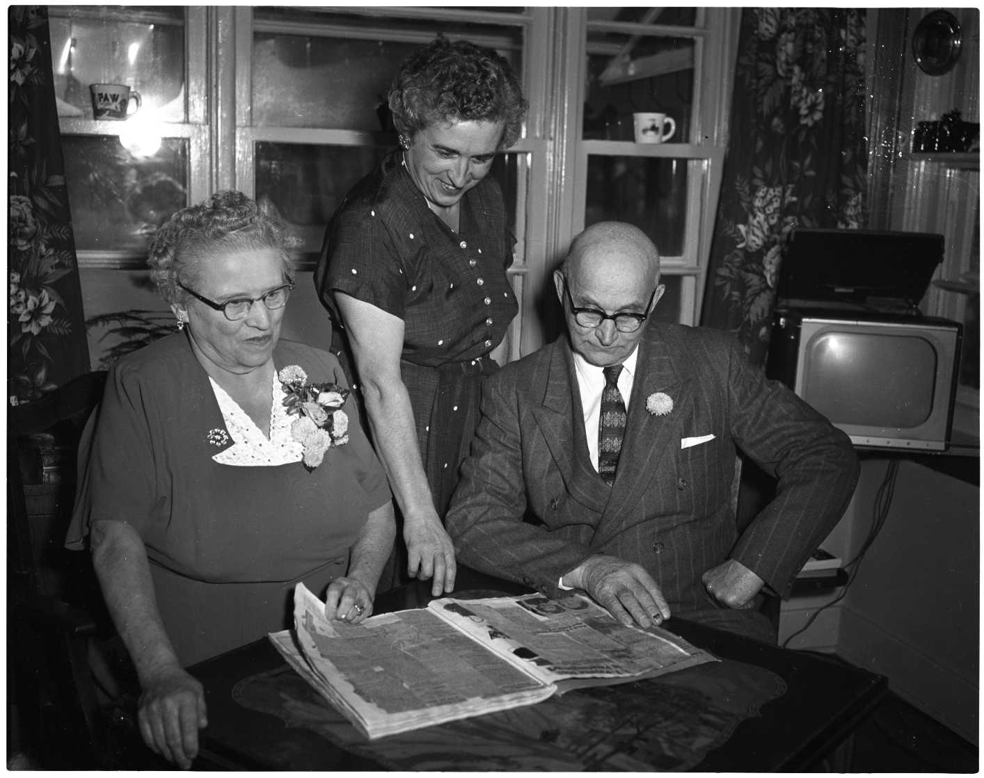 Mr. & Mrs. John Houden of Elmvale study an old scrapbook kept by their daughter Mrs. Howard Grier of Wyevale (standing) that tells of the day 50 years ago when the couple boarded the train in Elmvale to travel to Barrie to be wed. It was January 1st, 1908 and just past Colwell on the line to Barrie the train derailed and the coach rolled down a forty foot embankment. No one was seriously injured, even though the coach caught fire and was completely destroyed. The Houdens went on to Barrie and were married.