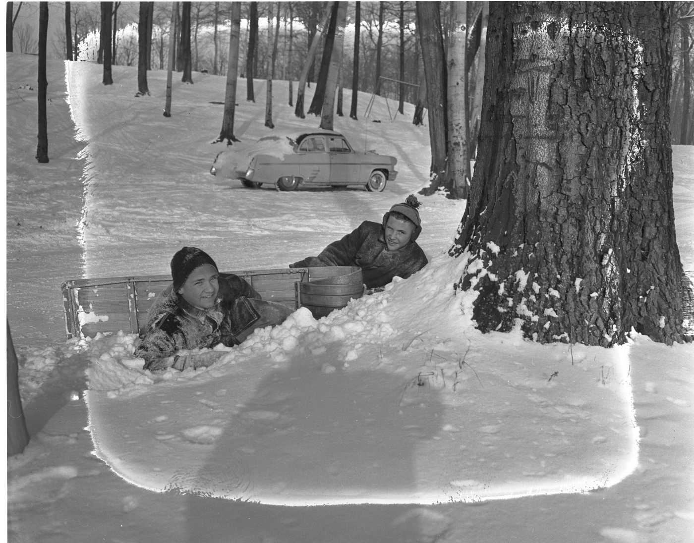 Near collision with the tree at right failed to dampen these two Midland lads’ enthusiasm for tobogganing. Paul Tremblay left, and Ken Cleary were only two of the many children that “rediscovered” Little Lake Park as a winter playground during the last few days of the Christmas holidays.
