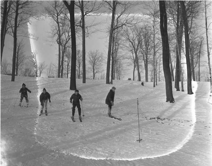It was a case of “look out below” when these four enthusiastic but “green” skiers tried out the long boards in Little Lake Park recently. It was a belated chance to try out Christmas skis and toboggans after weeks of bare ground. Skiers are Keith Cleary, Bob Gray, Tom Davis and John Adamson.