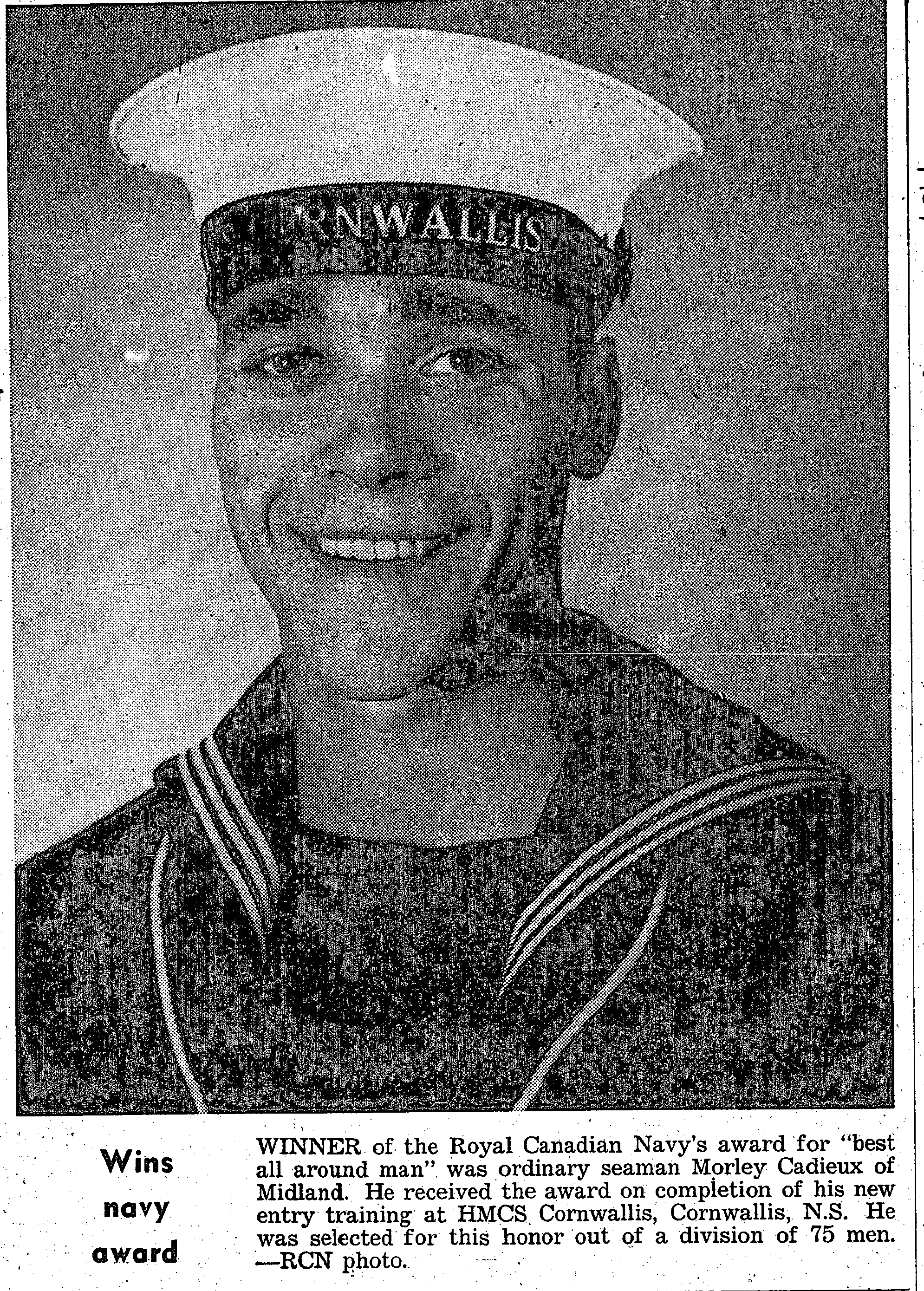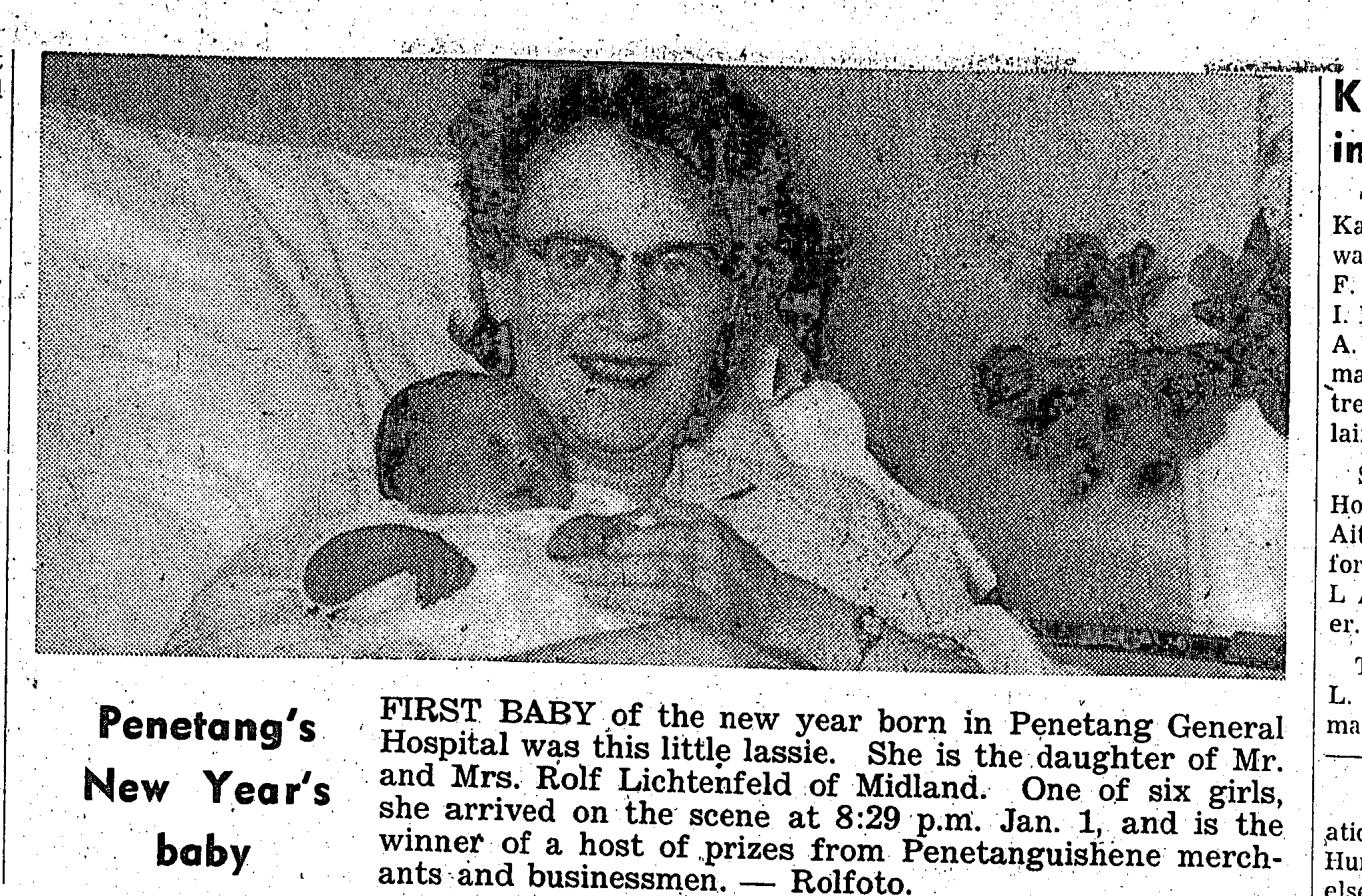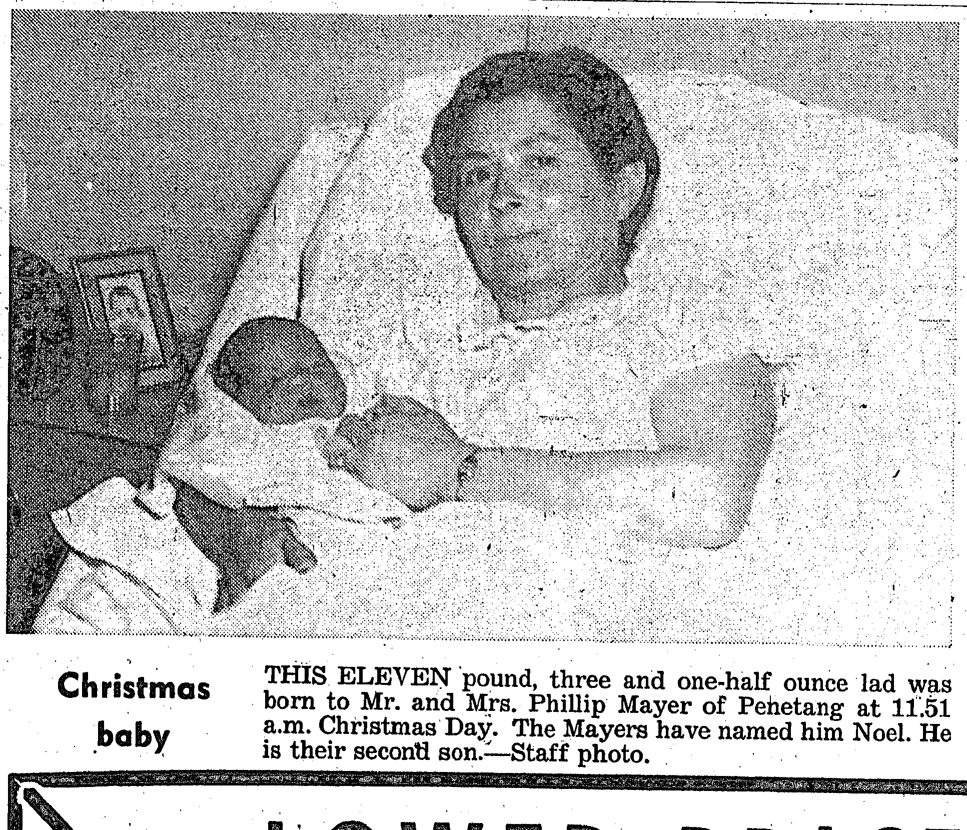 This little girl, daughter of Mr. & Mrs. Harold Bumstead, Wyevale, will have no problem remembering her birthday. She arrived on the scene in St. Andrew’s Hospital, Midland, Christmas Day. Christine is the third daughter of the Bumsteads, who so far have no sons. ( one more daughter and two sons followed)