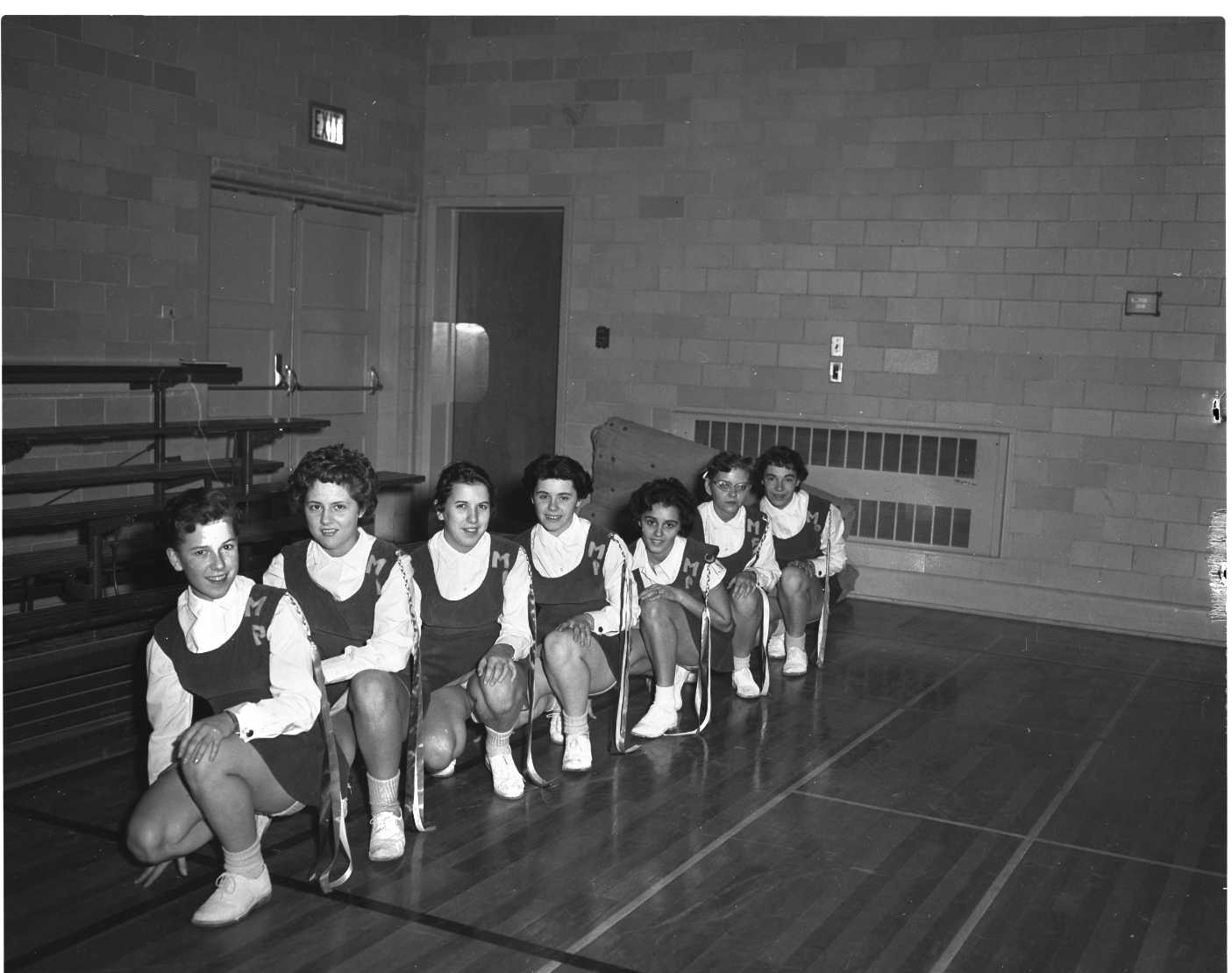 With three boy’s and two girl’s basketball teams in action this season the MPDHS cheerleaders get lots of opportunities to display their talents in the new gym. Judy Bellaire, Gail Richardson, Marion Lavigne, Jean Brown, Carol VanLuven, Mary Lou Brissette and Lucille Duquette.