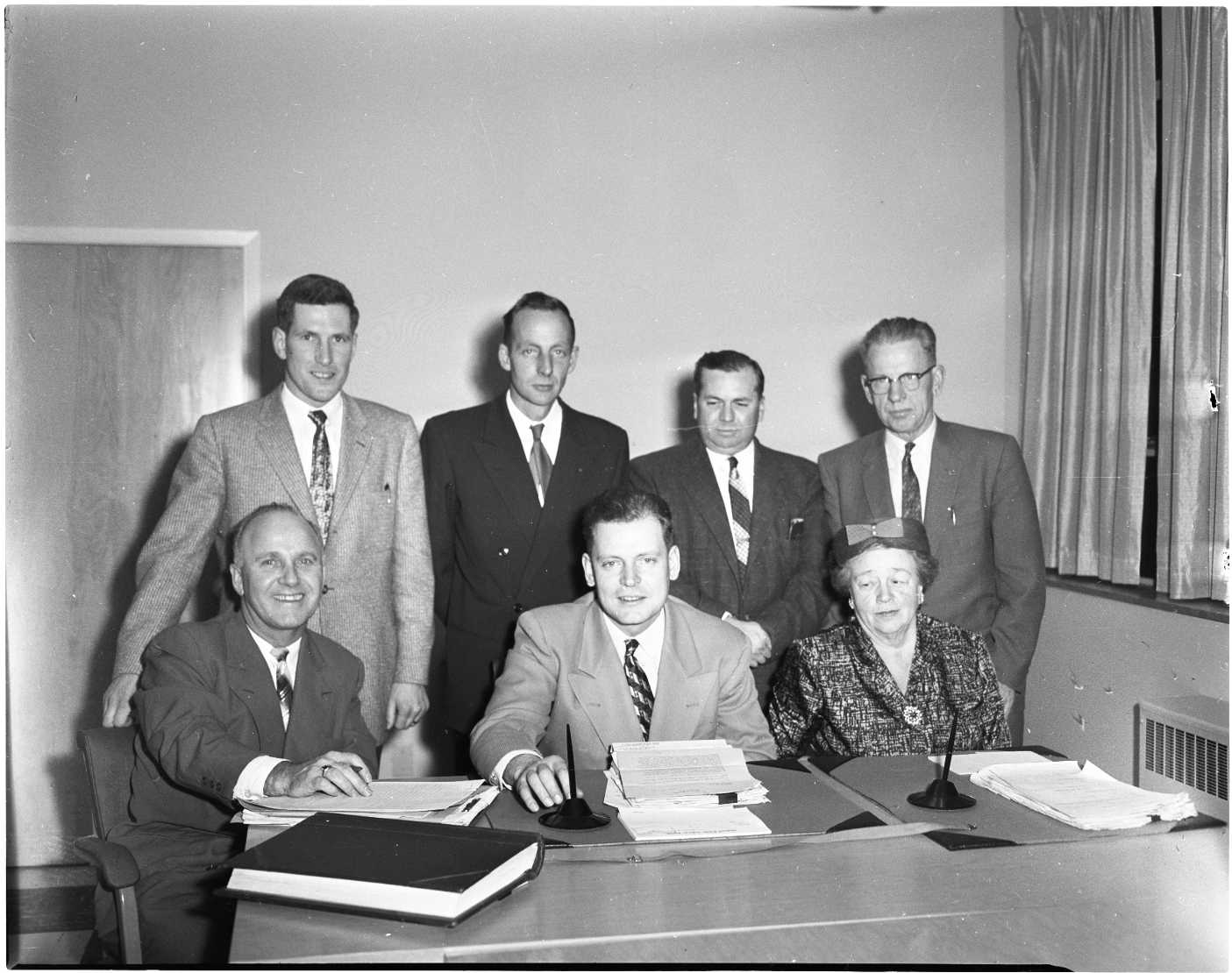 Inaugural meeting of the 1958 Midland Public Schools Board. Front, W. A. (Bill) Hack secretary, Chairman Frank Bray and Mrs. H. McIntyre chairman of the management committee. Back row, Jack Thompson chairman of property, Harold Wilcox, John Burke and Frank Whiteman. Mr. Burke and Mr. Whiteman are new to the board and replace Tim Nesbit and Dr. J. S. Corcoran.