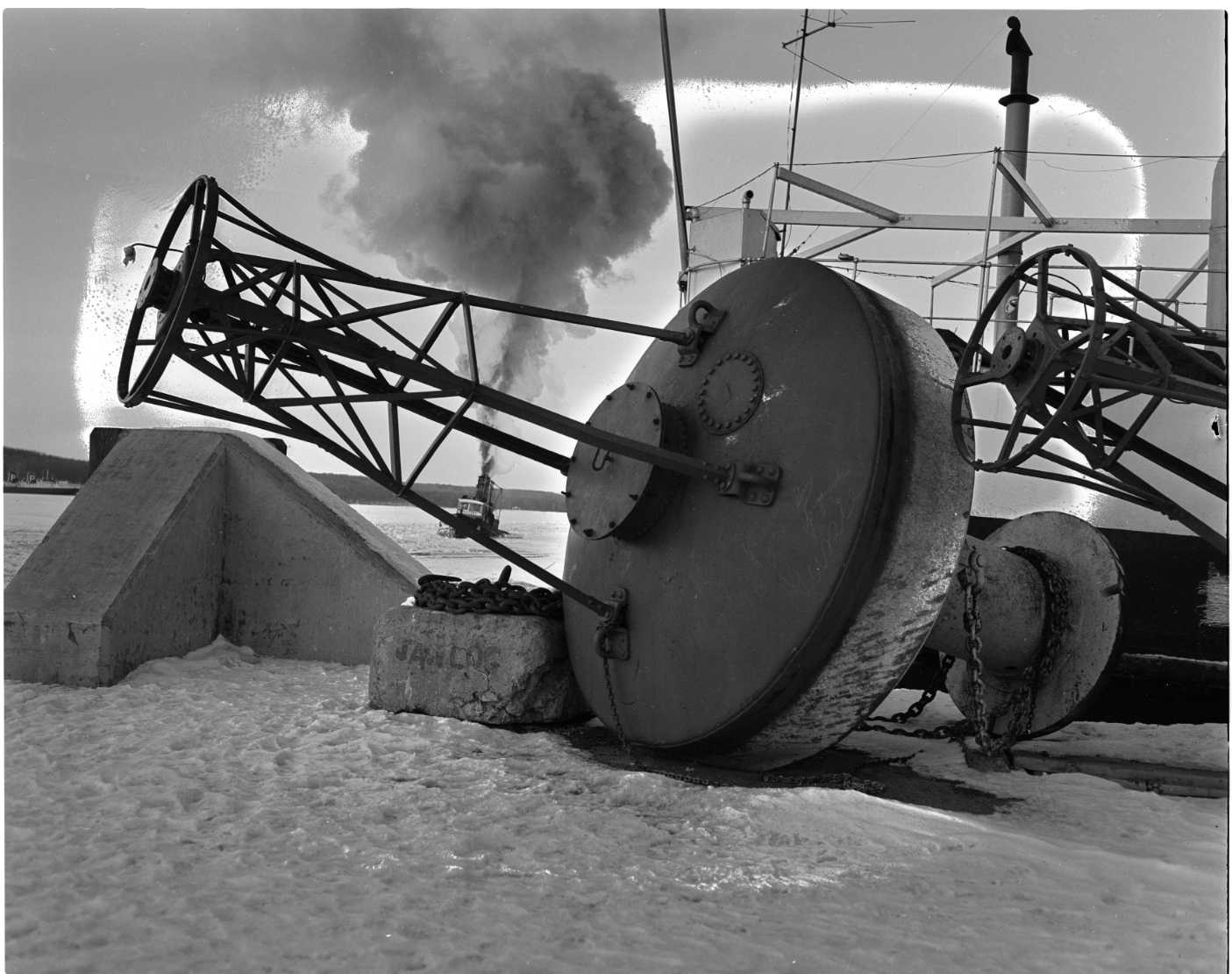 Bell buoy from Georgian Bay, sitting out the winter on the Midland dock, frames the busy tug Bayport as it clears a channel in the bay for movement of grain-laden ships. The Bayport’s activities extend around the bay to Tiffin and Aberdeen elevators and as far as Port McNicoll, some five miles away. Movement of grain from the elevators has been brisk in recent weeks after many idle months.[Perhaps some knowledgeable sailor can tell us the meaning of the word or words “JAW LOG” on the buoy’s anchor.] (On April 23, 2020 we are told by Jim McKean, son of F. K. McKean, district agent for the Department of Transport in Parry Sound, that it actually says “Sawlog” indicating the buoy for Sawlog Bay.)