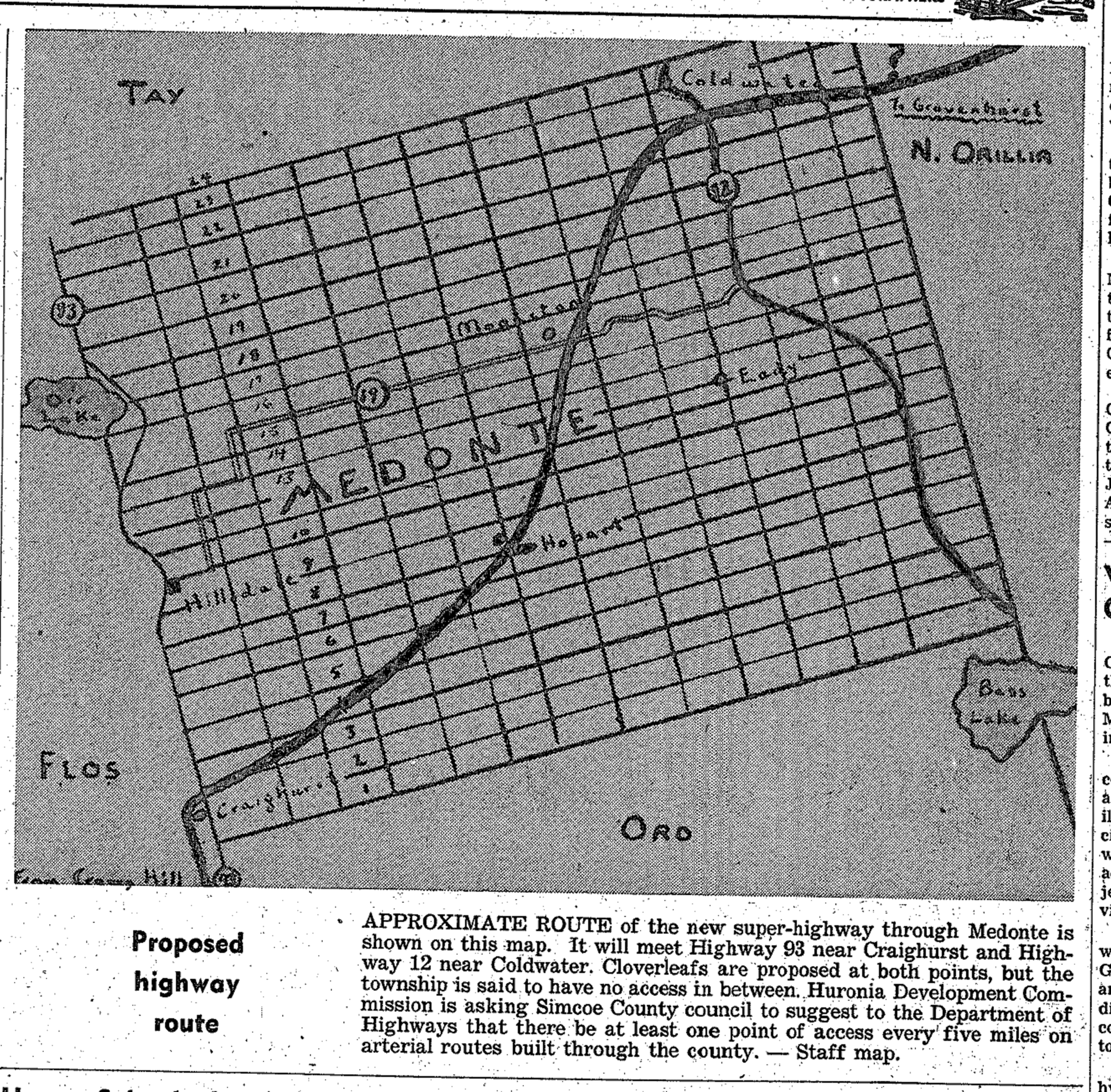 This highway was completed in 1959 and was known as the Highway 400 Extension. As you can see the plan was to build from Coldwater to Gravenhurst, the route to Gravenhurst was surveyed but never constructed.