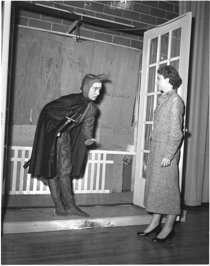The devil bids goodbye to Miss Appleby, after failing in all his temptations. Wayne Parker and Judy Campbell were the stars of ‘The Devil and Miss Appleby’, entry of Midland-Penetang District High School in the third annual Georgian Bay Drama Festival. Midland won the best play award at the festival, held at Barrie District North Collegiate last Friday and Saturday.