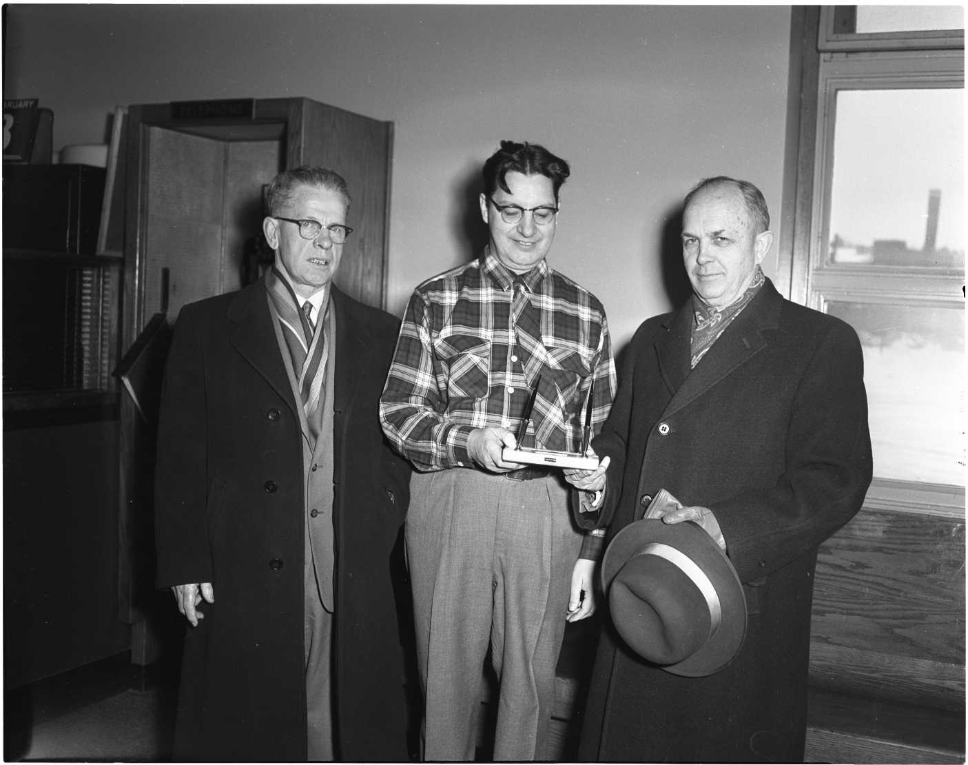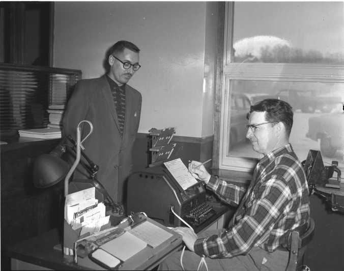 Telegraph operator in Midland for the CNR for the past 12 years, John Scharbach takes over a new post in Toronto next week. Mr. Scharbach is seen in the center, upper picture, with CNR agent Frank Whiteman, left, and Charles Vent, following the presentation of a desk set by fellow employees and representatives of several Midland firms. Below, Mr. Scharbach checks over some messages with “Bill” Mitchell, left, his successor in Midland.