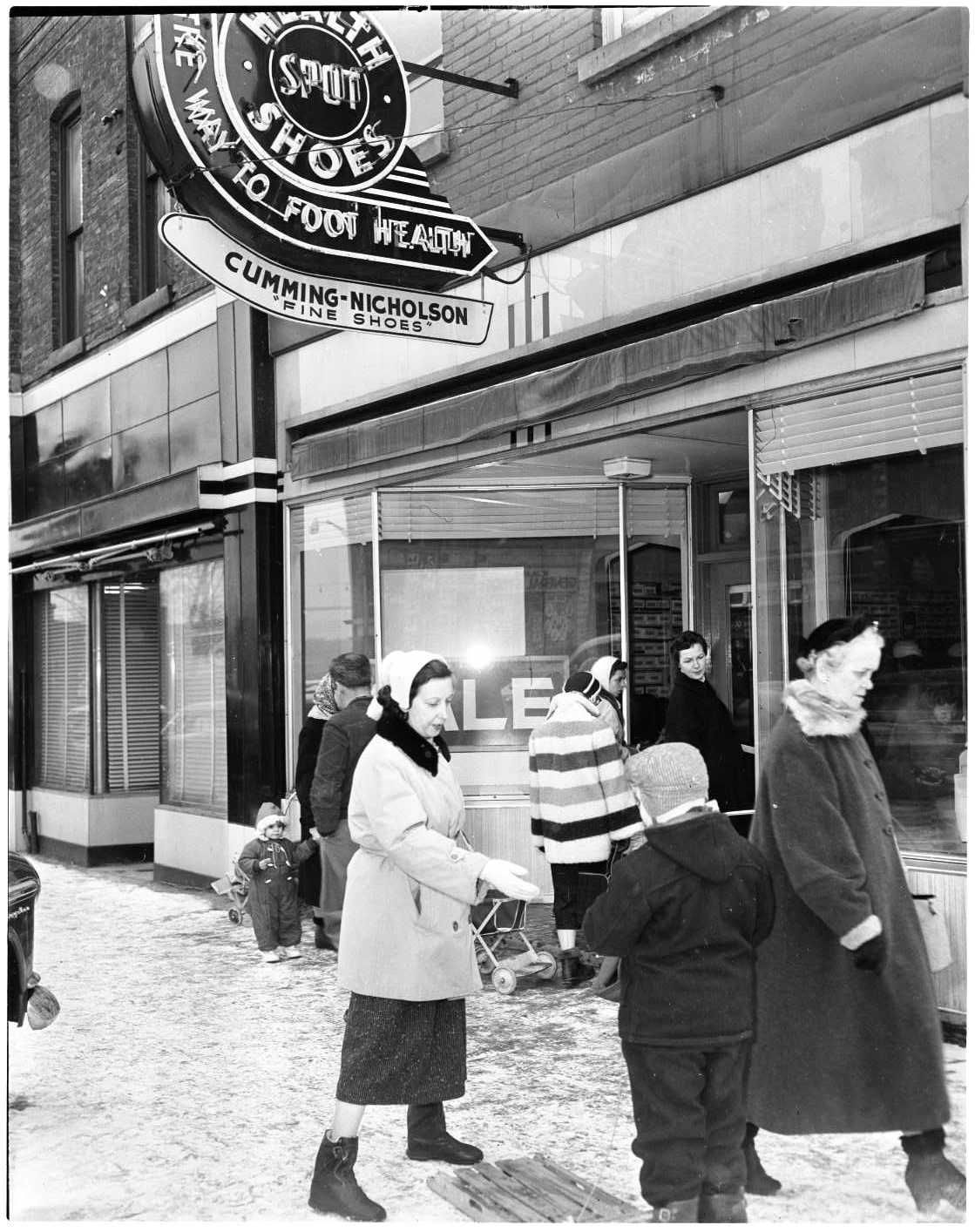 A cross-section of the crowd which filled Cumming-Nicholson shoe store in Midland Thursday is shown above. The photo was taken soon after the store opened for its annual shoe sale. The sale was announced in a quarter-page advertisement which was published in the Wednesday, Jan. 29, Free Press Herald.