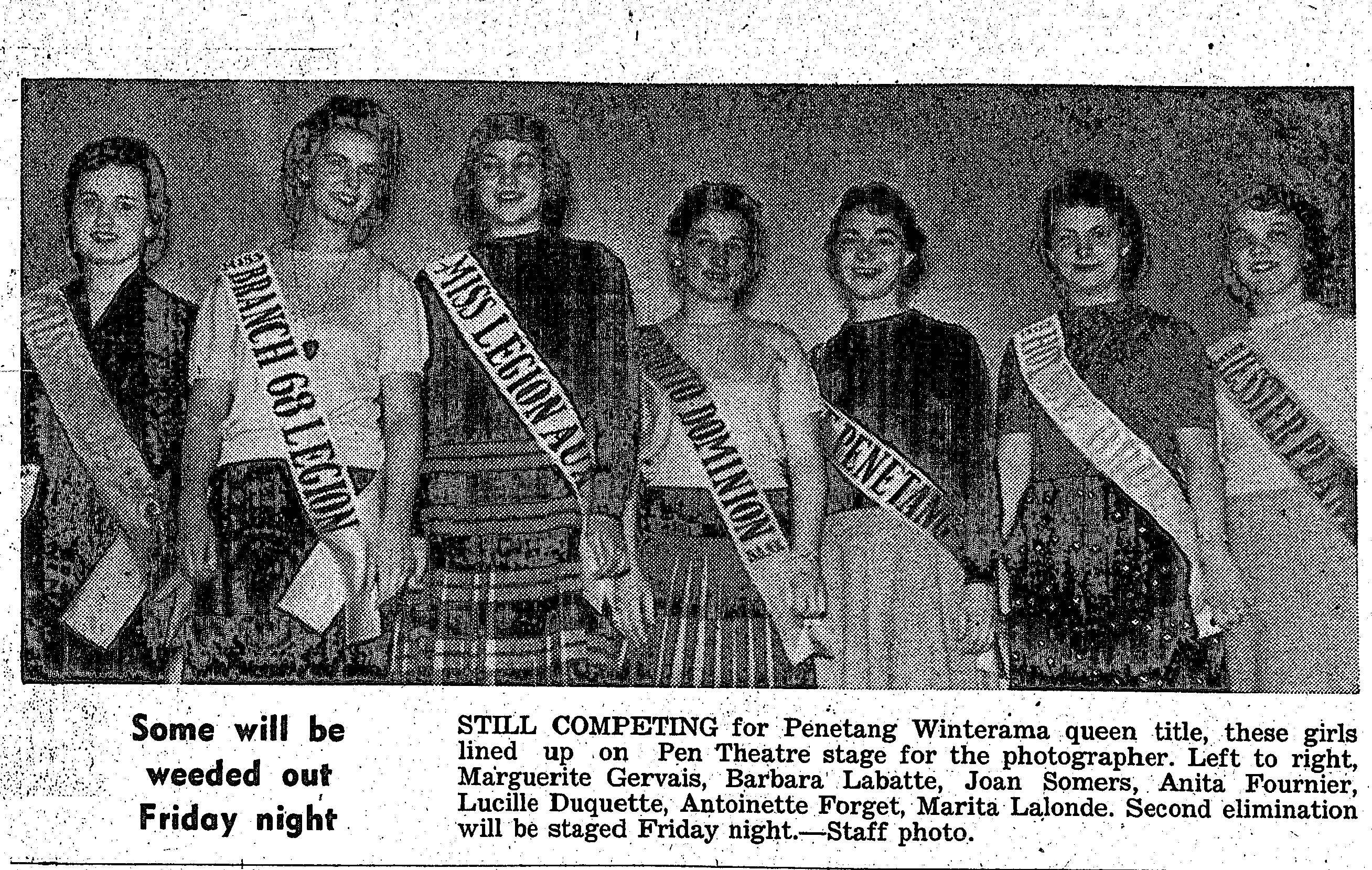 - “Oh, Mom, it was so wonderful can hardly find words to describe it.” Lorraine Lacroix, returning from five days spent at the St. Paul, Minn., Winter Carnival, repeated these words several times as she rode in the back seat of a car with her mother, from Malton to Penetang, last Wednesday night. Miss Lacroix, Penetang’s 1957 Winterama Queen, had been invited to attend the St. Paul event as one of 19 visiting “Snow Princesses”. “Everyone was wonderful to us there, and we couldn’t possibly have been treated better,” she said, as she explained the elaborate plans carried out to ensure the comfort of the visiting guests. “I was so glad when they played and sang Alouette, I felt right at home then, and I had to sing it in French,” she said.