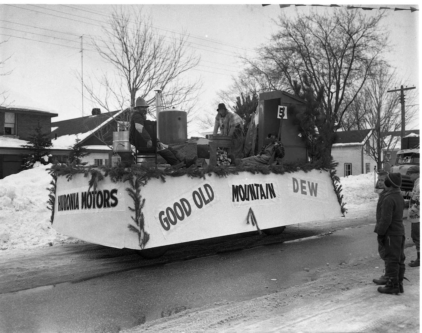 Winning float in the Penetang Winterama parade was this flower be-decked entry by the Penetang Bottling Co. Catharine Dubeau is holding the rose bowl trophy presented following Saturday’s parade. Thousands lined the streets to view the parade.