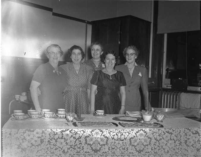 Presiding at the tea table during ‘open house’ at Sixth Street School last week were these members of Midland Home and School Association: from left to right, Mrs. A. Herron, Mrs. A. Brooks, Mrs. L. Reynolds, Mrs. A. Bligh, and Mrs. E. Jardine.