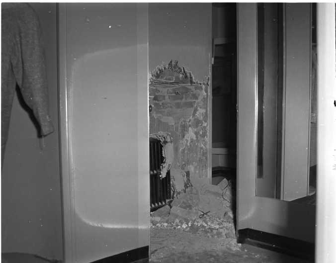 Thieves escaped with $1,100.00 after knocking this hole in the side of a vault at Walkers Store Ltd, Midland, early Sunday morning. The same gang is believed to have tried a similar theft at the Walkers store in Peterborough the previous night.