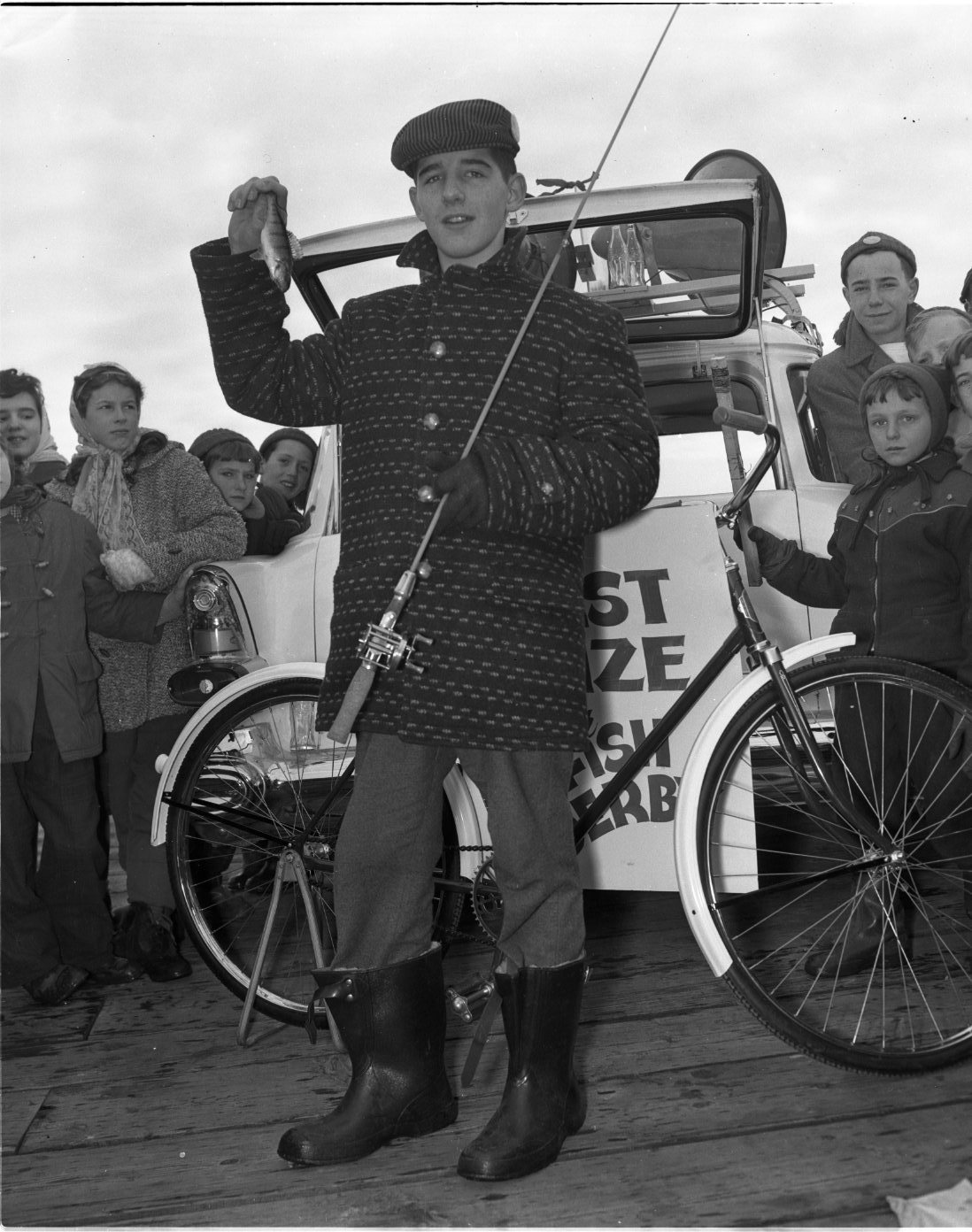 Ingo Schaus, Midland, shows the perch which brought him the first prize bicycle in the junior fishing derby Sunday afternoon at the Penetang Winterama. Rene Lesperance, Penetang Jaycee member, made the presentation.
