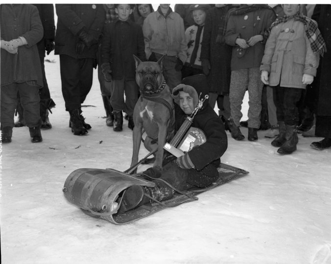 Most of the prizes at the Penetang Winterama went to out of town entrants, and the “mutt race” was no exception. Stephen Alexander from Toronto is shown here with his boxer who pulled him over the course to win the trophy.
