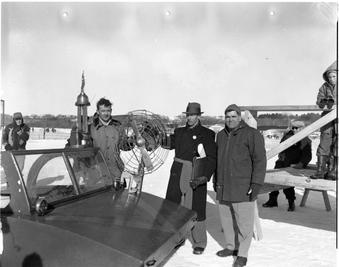 Don Mortimer of Mortimer’s Point, Lake Muskoka, is shown here with the scoot race championship trophy presented Saturday afternoon. Don had just completed building his scoot the previous night and brought it to Penetang on a trailer. (Need names for the gentlemen on the right)