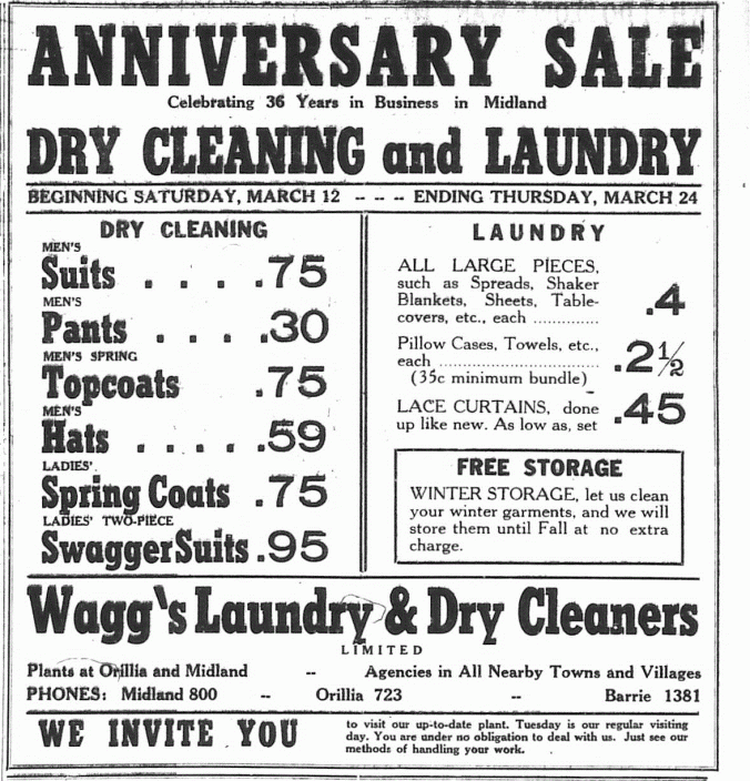 This ad shows that Wagg’s have been in business for 116 years in our area. The list of businesses that old is short, I can think of H. S. Stamant & Sons, Penetang, and Sanderson Monuments of Orillia.