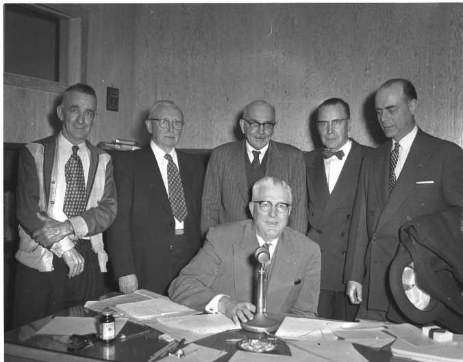 Dr. P. B. Rynard made his victory speech from the election news desk of the Free Press Herald Monday night. The Progressive Conservative standard bearer was re-elected in Simcoe East with an increased majority, ahead of Liberal John R. MacIsaac and CCF’er William Winchester. [The other men were cropped out of this photo as it appeared in the newspaper. Local insurance agent Les Taylor is seen on the right and optometrist Art Tweedle beside him.]