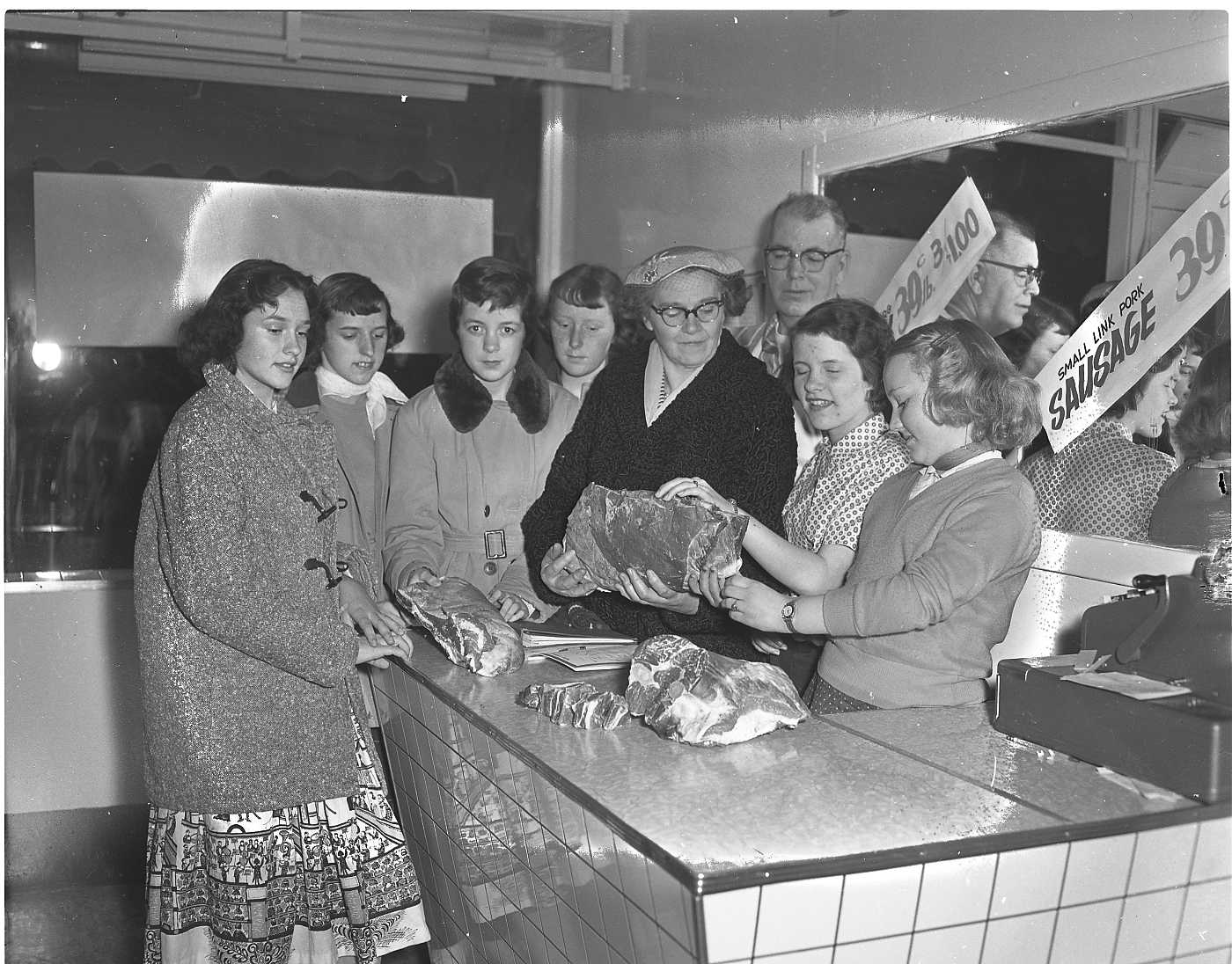 One of the sad awakenings of young “hubbies” is to find that the little woman doesn’t know a pot roast from a leg of mutton. These members of Waverley 4-H Girls’ Club, seen with their leader, Mrs. Bert French, learned something about meats during a meeting at Argue’s meat market, Midland, last Wednesday. Left to right, girls are Peggy and Carole Robertshaw, Sharon Crowe, Linda Horning, Anne French and Anne Handy. Mr. Argue, at the rear, and Canada Packers co-operated in the demonstration.