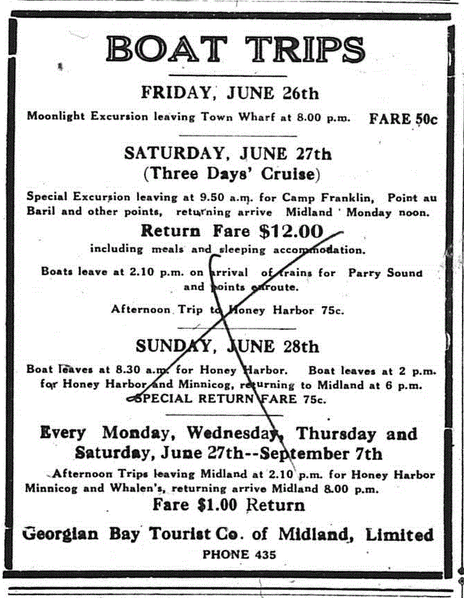 1931 Argus advertisement for The Georgian Bay Tourist Company and a 1923 Argus advertisement from the local Ford dealer for a conversion kit to turn your Ford into a sedan.