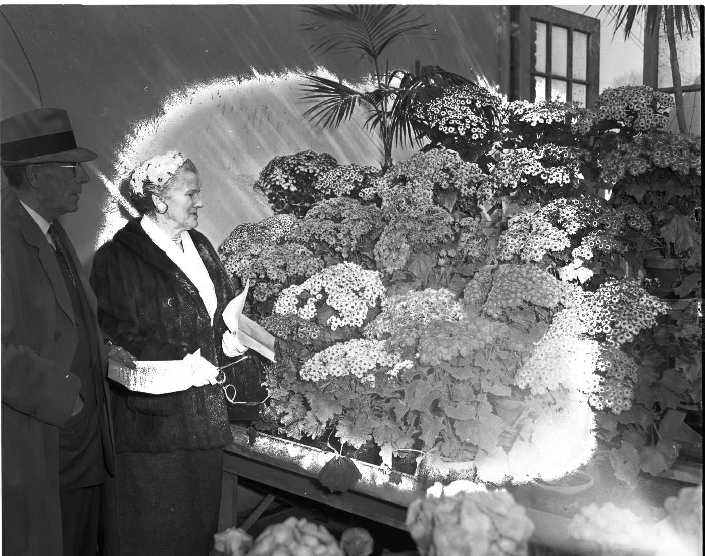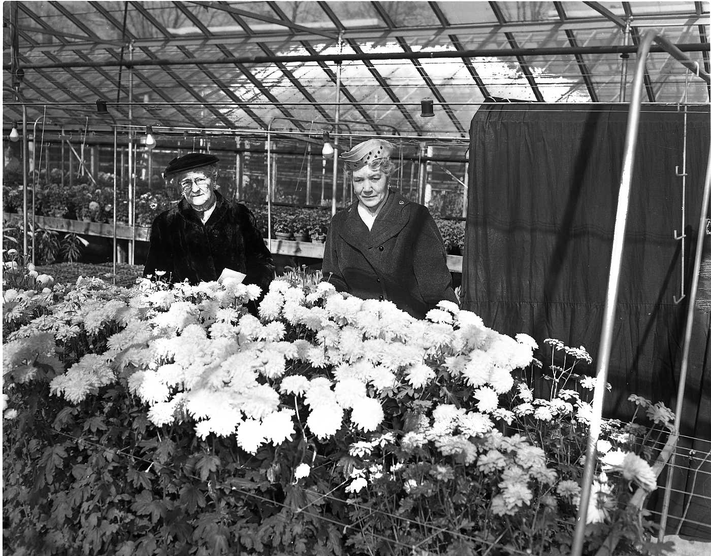 Spring flowers proved an irresistible attraction for hundreds of Midland residents who toured Mac Perrin’s shop and greenhouses March 30. Tour was sponsored by the Women’s Auxiliary of the YMCA. Mrs. J. H. Sargent left, and Mrs. E. H. Zimmer stop beside a bed of chrysanthemums.
