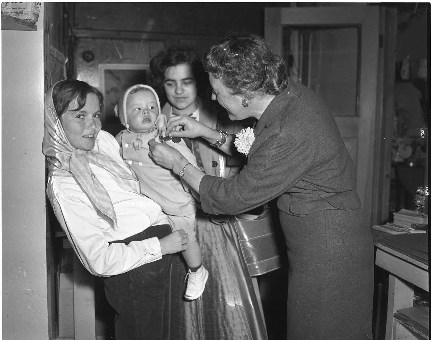 Mrs. Perrin pins a rose on one of the youngest visitors, Perry Gordon. Watching are Gail Tremblay, left, and Sharon Moreau. [Perrin’s greenhouses were located along Bourgeois Lane behind Cathy Boyd’s Gallery, the former Perrin’s Flower Shop.]
