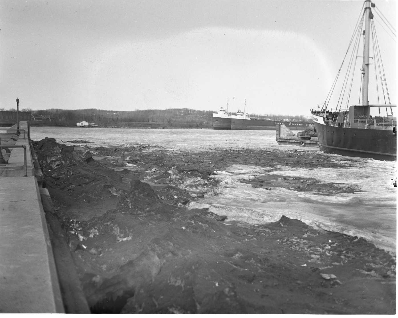 Anything but a pleasing sight these spring days is the main slip at Government Dock in Midland harbor. Sand and muck cover the snow dumped alongside the dock, where it has been deposited all winter long from Midland streets. Tin cans, bottles, and other garbage litter the center portion of the slip.