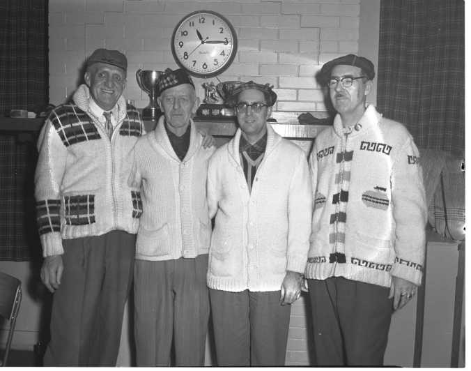 Ike Cumming’s rink emerged winner of the H. J. Thompson competition at Midland Curling Club this winter. Left to right are Ed Sutherland, Ike Gumming, Charlie Walton and John Dalrymple. Other winners included Dr. Jim Small in the “Early Bird” competition and Karl Bertrand’s rink in the Industrial League.
