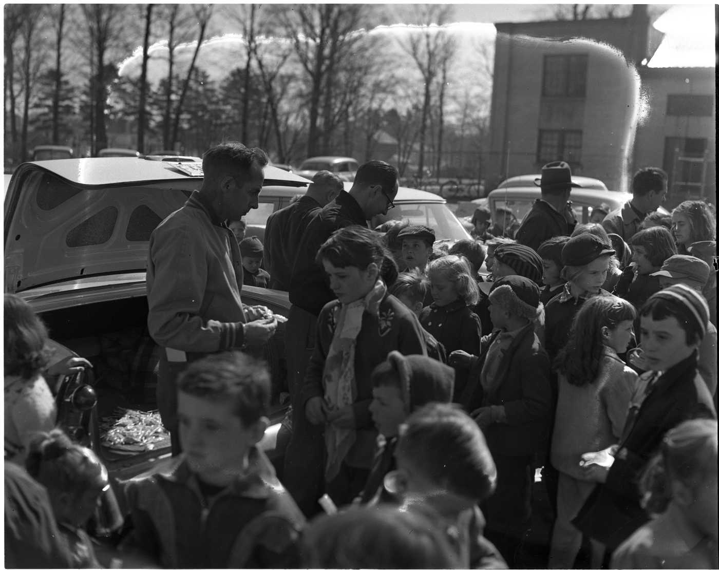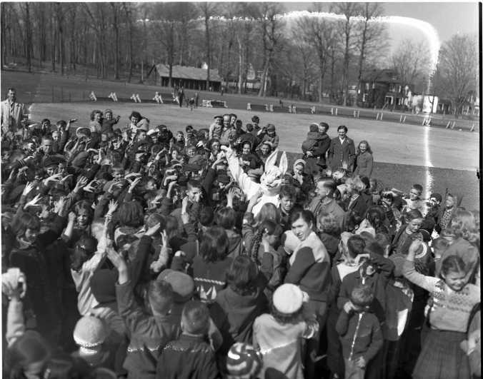 Hundreds of children, young and old crowded around the Easter bunny in Little Lake Park Saturday morning prior to the annual Easter egg hunt in the park. Here Mr. “Wabbit’s” well-wishers give him a cheer. Prior to the start of the hunt, the children took part in a sing-song of Easter songs led by V. B. Strickland. Each child also had an opportunity to shake hands with the bunny. More than 50 special prizes were distributed to those who found the lucky tokens hidden among the grass, leaves, tree roots and stumps in the park. There were few sticks, piles of leaves and stones left unturned after the wave of hunters had passed.