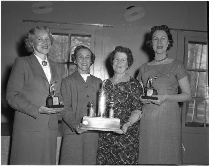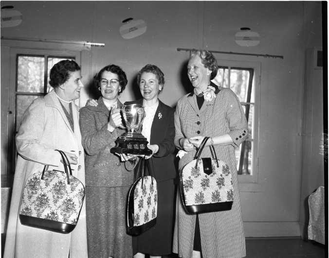 First schedule winners on the distaff side at the Midland Curling Club, are pictured here with the Men’s Club Trophy and handbags they won in the competition. From left to right are lead Margaret Johnston, skip Mrs. Charles Walton, vice-skip Mrs. James Tully and second Mrs. Ken Ellis.
