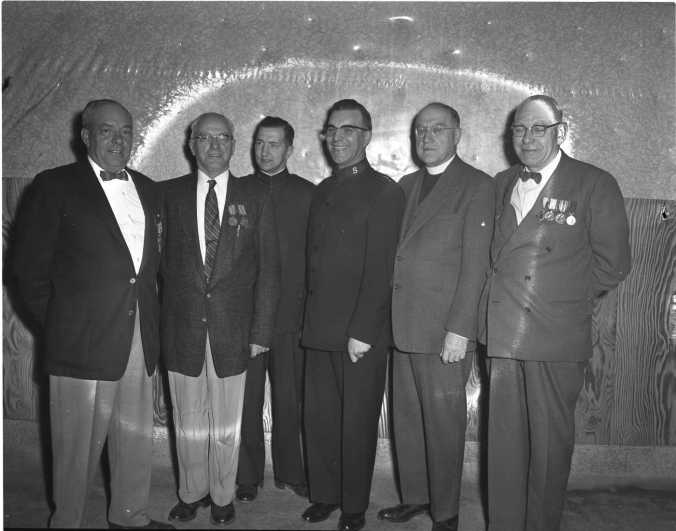 For the first time in some twenty years, veterans of the Midland area held a Vimy dinner at Parkside Inn Wednesday night, commemorating the great battle of April 9, 1917. Among the officials present were, left to right, Charles Stewart, Ernest Hurl, Envoy J. Thompson, Midland, and Cpt. R. G. Ellsworth, Orillia, both of the Salvation Army; Rev. W. R. Auld, H. A. Wiles.