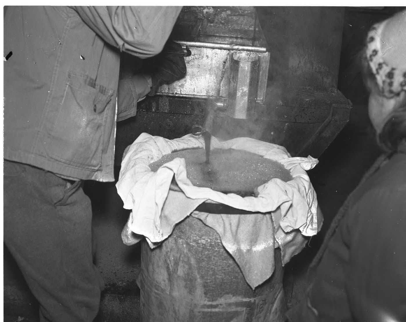 Steaming hot and full of bubbles, maple syrup is drawn from the end of the evaporator and strained through several thicknesses of cloth to ensure a pure product.