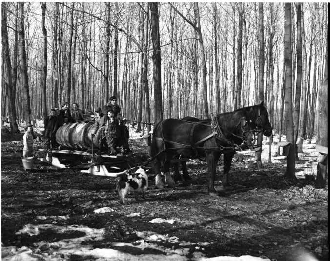 The old and the new are graphically illustrated in this sugar bush where both horses and tractor are used. The team draws sleigh-mounted cask for picking up sap.
